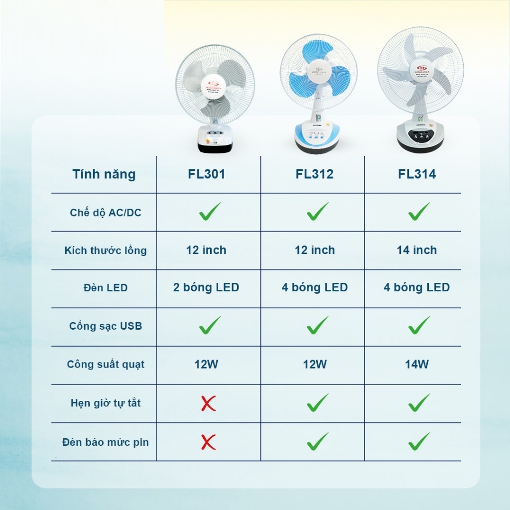 • Nếu không sử dụng tới điện từ pin của quạt hơn 1 tháng, nên sử dụng quạt ở chế độ DC để xả pin, sau đó sạc đầy lại.   THÔNG SỐ SẢN PHẨM FL314 Nguồn điện: AC 100V-240V/50Hz Số cánh quạt: 5 cánh Kích thước lồng quạt: 14 inch Bóng đèn LED: 4 LED Đèn LED báo mức pin: có Công suất quạt: 14W