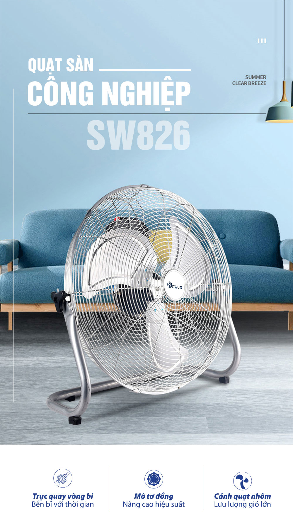 Khác với các thiết bị quạt công nghiệp có cánh bằng nhựa, dễ bị hư gãy do tác động từ bên ngoài. Quạt sàn công nghiệp Sowun SW 826 có cánh bằng nhôm bền, nhẹ, chắc chắn, khó bị hư hỏng do tác động mạnh từ bên ngoài. Bên cạnh đó, do thiết kế cánh quạt 3 cánh 16 inch làm giảm lực ma sát của không khí, quạt sẽ hoạt động hiệu quả hơn, năng suất hơn và giúp tiết kiệm điện năng. Điều này hoàn toàn phù hợp với nhu cầu sử dụng của mọi người, mọi nhà và những nơi có không gian mở.