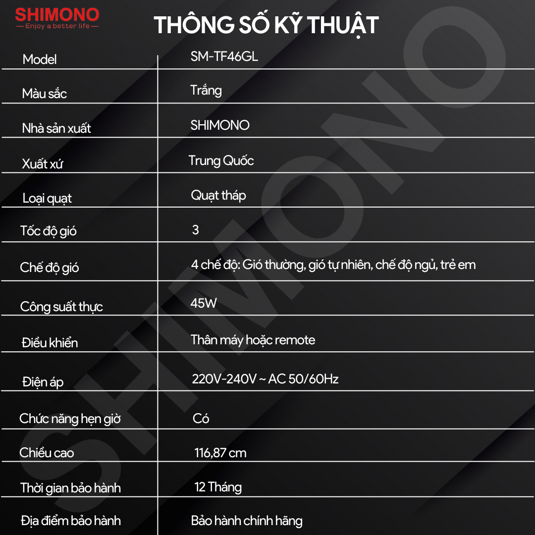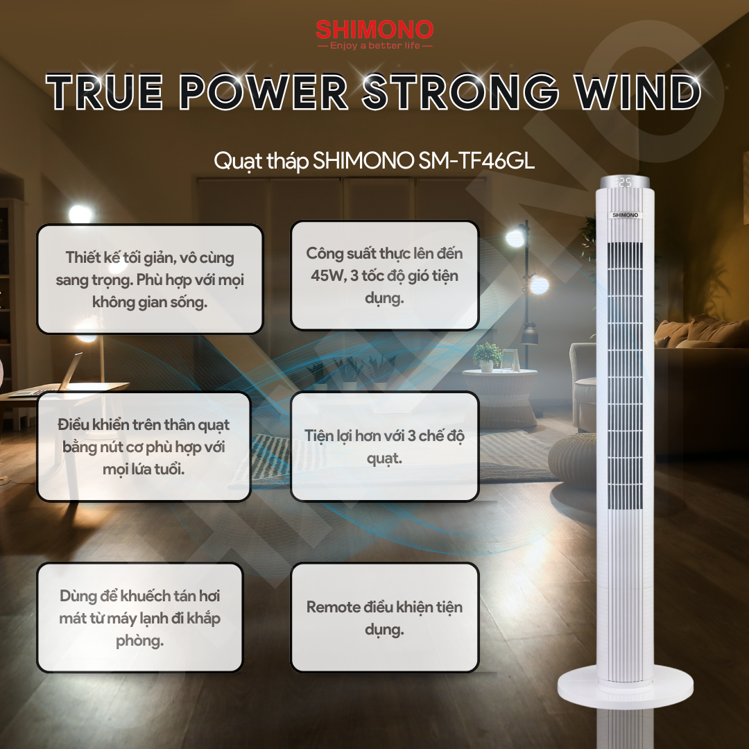 - Vận Hành Êm Ái và Tiết Kiệm Điện Quạt Tháp Shimono SM-TF46GL vận hành êm ái với công suất chỉ 45W, giúp tiết kiệm điện năng mà vẫn đảm bảo hiệu quả làm mát cao. Sản phẩm đạt các tiêu chuẩn chất lượng quốc tế như CE, CB, GS, GROHS, ECM, ERP, đảm bảo an toàn và đáng tin cậy.
