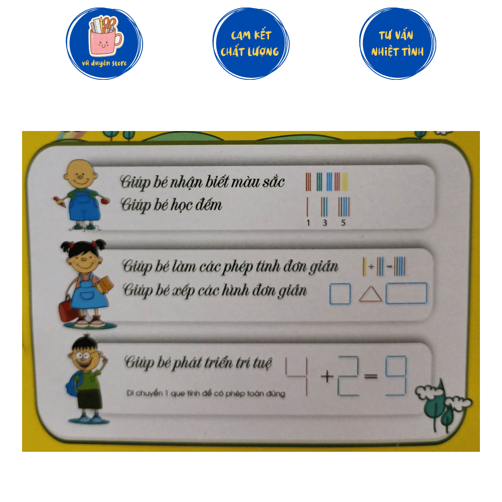 Mua tại TiktokQue Tính Thông Minh Antona Giúp Bé Làm Phép Tính Đơn Giản Được làm bằng nhựa an toàn nên có độ bền cao và an toàn . Kích thước: 12.5x24cm Giúp bé nhận biết màu sắc, giúp bé học đếm Giúp bé phát triển trí tuệ Đóng gói: 20 que tính/ hộp Dành cho bé trên 3 tuổi Xuất xứ: Việt Nam