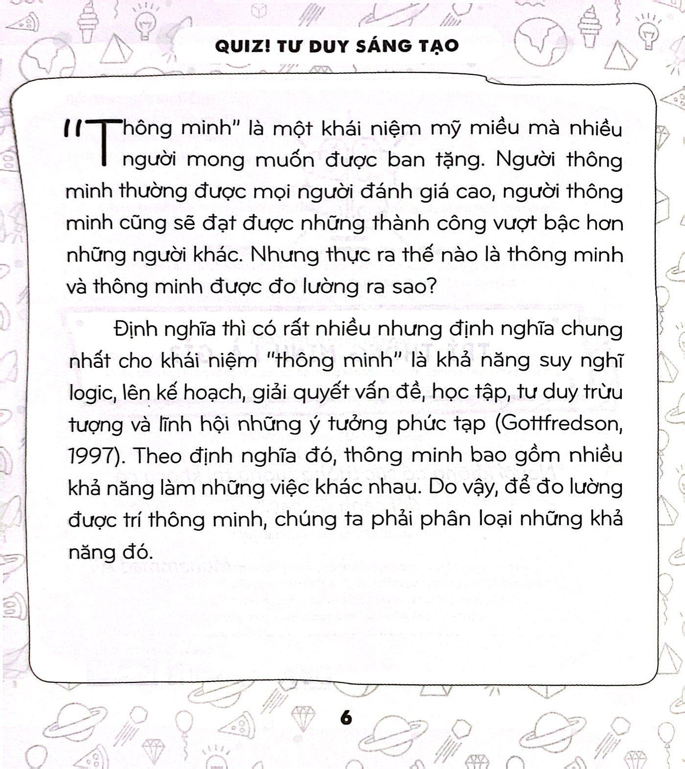 Và Bộ sách Quiz! Tư duy sáng tạo không nhằm mục đích đo lường trí thông minh mà giúp bạn nâng cao một trong chín loại trí thông minh của con người. Hy vọng thông qua cuốn sách này, bạn sẽ thông minh hơn và thành công hơn trong cuộc sống.