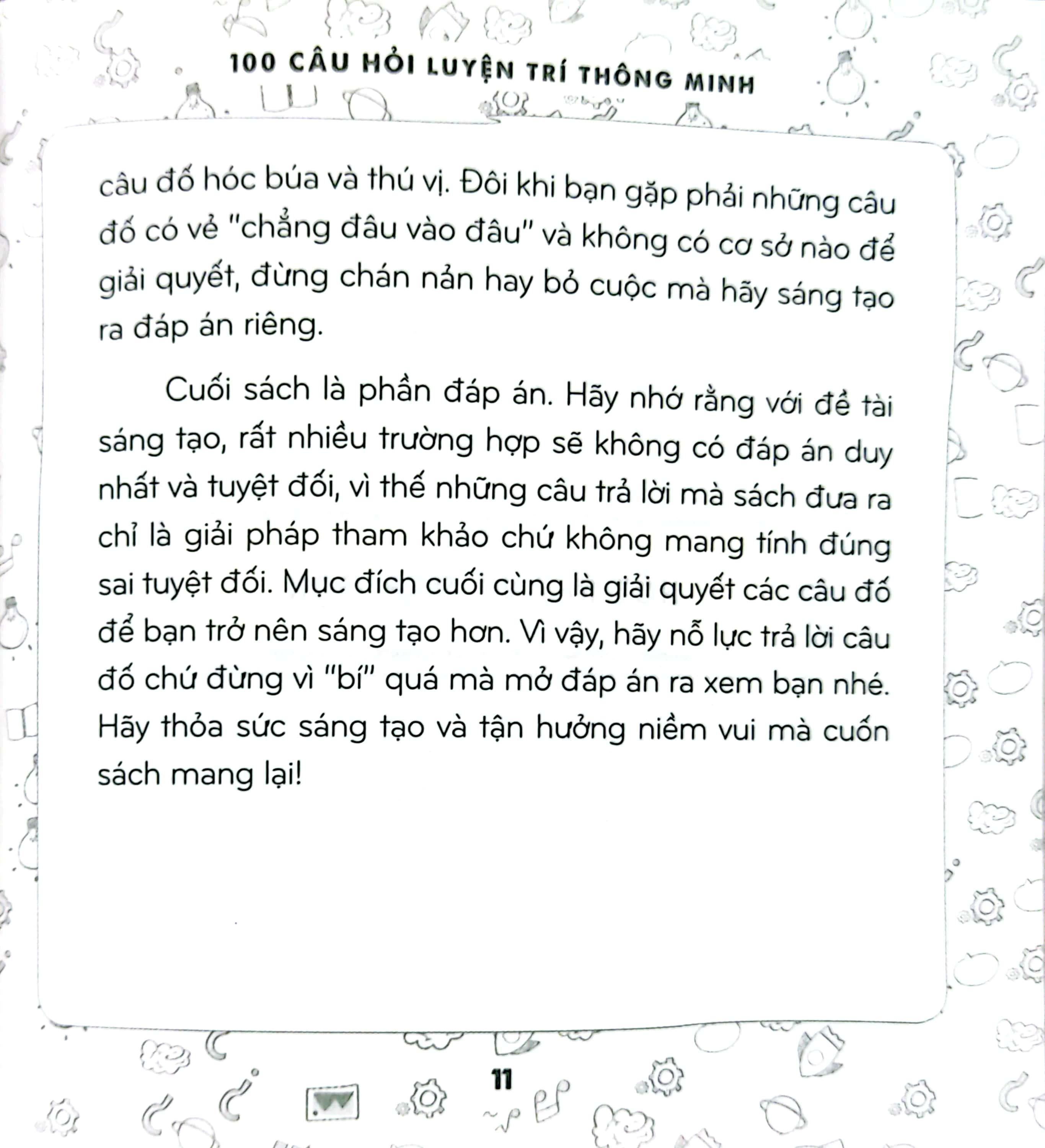 Mỗi cuốn sách gồm 100 câu hỏi được thiết kế đa dạng, phát triển nhiều loại hình trí thông minh và giúp người đọc nâng cao khả năng sáng tạo thông qua những câu đố hóc búa và thú vị. Đôi khi bạn gặp phải những câu đố có vẻ “chẳng đâu vào đâu” và không có cơ sở nào để giải quyết, đừng chán nản hay bỏ cuộc mà hãy sáng tạo ra đáp án riêng.