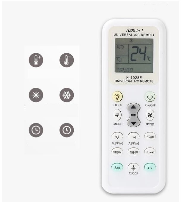 Điều khiển điều hòa đa năng dùng được cho tất cả các loại máy điều hòa như : Điều khiển Điều hòa P, Điều Khiển điều hòa T Điều Khiển điều hòa F…Bộ nhớ của nó chứa hàng nghìn mã của các loại điều hòa. Ngoài ra chiếc Remote Điều Khiển Điều Hòa Đa Năng còn tích hợp chức năng đèn pin để cho ai thích mò mẫm tìm tòi đêm tối.Thiết kế thời trang và thanh lịch, là phụ kiện thay thế tiện lợi cho chiếc điều khiển cũ đã bị hỏng.