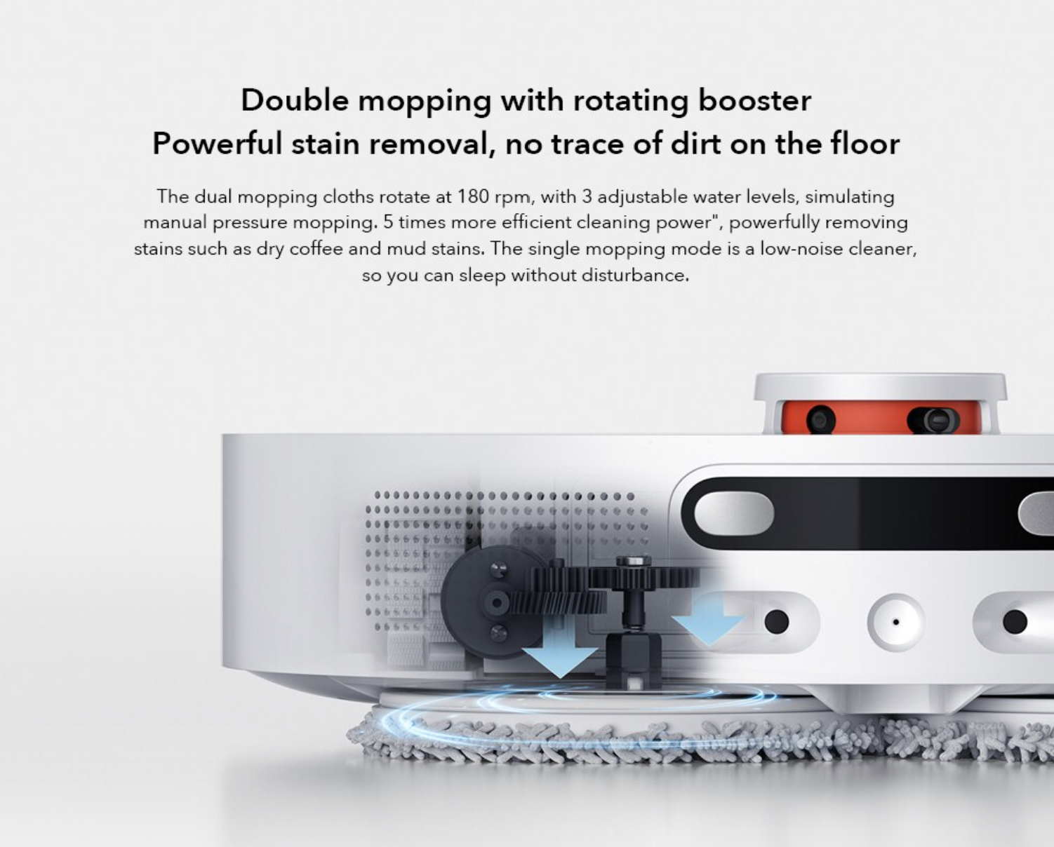 Được trang bị mô phỏng khả năng lau nhà bằng áp suất nhân tạo, mang lại hiệu quả làm sạch gấp 5 lần, có thể lau sạch vết cà phê khô, vết bùn khô và các vết bẩn khác trên mặt đất. Bên cạnh đó, quá trình vệ sinh cũng cực kỳ yên tĩnh, ít tiếng ồn, vì vậy người dùng sẽ có được không gian yên tĩnh khi robot hoạt động.
