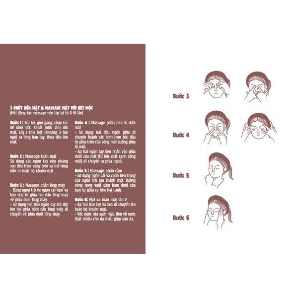 - Dùng hàng ngày 1-2 lần (sáng, tối). Với những người sử dụng ít đồ trang điểm và dưỡng da thì chỉ cần rửa một lần trong ngày, vào buổi tối. Lực massage lên bề mặt da tùy thuộc vào độ nhạy cảm của da và cảm nhận của từng người. Có thể dùng như mặt nạ dưỡng da, từ 1 đến 2 lần/ tuần 3 PHÚT RỬA MẶT & MASSAGE MẶT (Mỗi động tác massage nên lặp lại từ 8-10 lần) Bước 1: Lấy 1 thìa bột (khoảng 3 hạt ngô) ra lòng bàn tay, thoa đều lên mặt. Bước 2: Massage toàn mặt