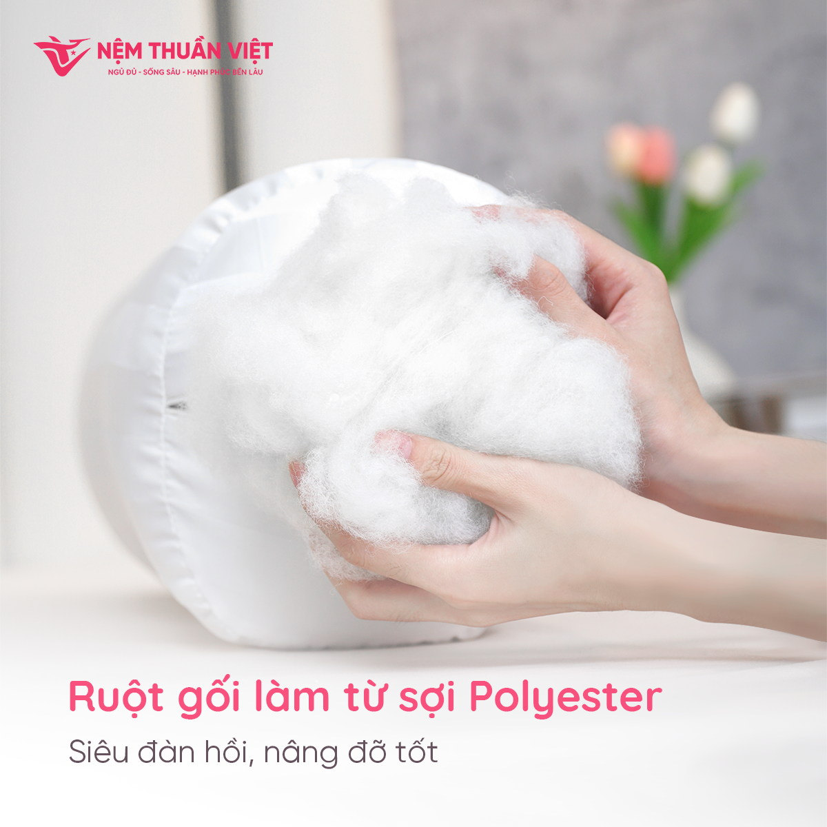 - Êm ái, thoải mái từ sợi bông gòn cao cấp Ruột gối ôm Thuần Việt được làm từ sợi Polyester. Chất liệu bông gòn nhân tạo cao cấp, siêu êm ái và mềm mại, lành tính cho làn da và sức khỏe người dùng.