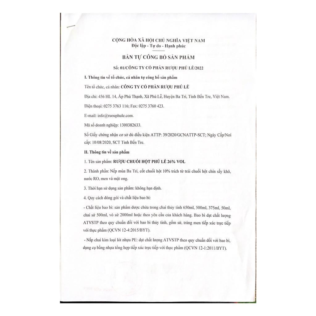 Sản phẩm của cơ sở sản xuất Rượu Danh Tửu Sản xuất và đóng chai tại nhà máy Rượu Phú Lễ --- Thành phần: Nếp mùa Ba Tri, cốt chuối hột rừng, men nấu