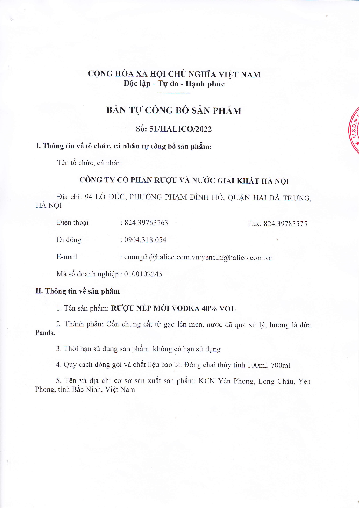 Rượu Nếp Mới được nấu từ loại ngũ cốc giàu tinh bột. Rượu ngon, tinh khiết, uống vào thấy vị cay thấm dần trong lưỡi. Rượu ngon nhờ men tốt, thứ men đặc biệt lưu truyền qua nhiều đời được Công ty Cổ phần Rượu và nước giải khát Hà Nội chắt lọc, tìm tòi, nghiên cứu, nuôi cấy thành loại men hiện nay làm đắm say lòng người. Rượu Nếp Mới khác biệt với các loại vodka khác nhờ có hương thơm đặc biệt. THÔNG TIN SẢN PHẨM:
