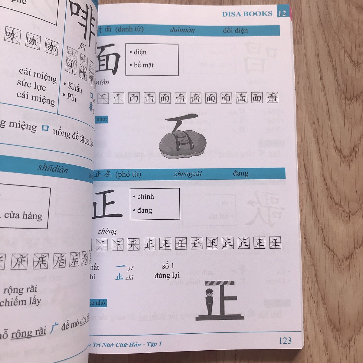 - Siêu trí nhớ chữ Hán tập 03(In màu, có Audio nghe) Nội dung sách: Giúp bạn dễ dàng nhớ ngay 1000 chữ Hán chỉ sau 2 tháng thông qua mẹo nhớ và hình ảnh dễ hiểu. Tác giả: Diệu Hồ – Phạm Thành Luân Số trang: 267 Năm xuất bản: 2019 Nhà Xuất Bản: Đà Nẵng Cách nhớ chữ Trung Quốc (chữ Hán) a. Nhớ chữ Hán bằng các bộ thủ Bộ thủ chính là cách nhớ chữ Hán hiệu quả nhất, mỗi bộ thủ trong tiếng Hán lại biểu hiện một hiện tượng sự vật riêng. Nhớ được các bộ thủ đó chính là đã nhớ cách viết tiếng Trung như thế nào. Và việc còn lại chính là ghép các bộ thủ đó với nhau để tạo nên được một chữ hoàn chỉnh. vd: chữ 安 Ở trên là bộ 宀 miên => mái nhà mái che, Ở dưới là bộ女 nữ => nữ giới, con gái, đàn bà. Người phụ nữ ở dưới trong nhà thì rất “an” toàn. Ví dụ: 安全 (Ānquán) – An Toàn. Mẹo nhỏ cho những người mới học viết tiếng Trung có thể nhớ đó là dùng các mảnh giấy nhớ, ghi lại những bộ thủ hay những từ mới bằng việc tập viết tiếng Trung. Để những mảnh giấy nhớ đó ở những nơi dễ thấy. Việc nhìn liên tục đó sẽ giúp bạn vừa có thể nhớ chữ vừa có thể nhớ từ. b. Cách nhớ chữ Hán qua thơ Các từ chữ Hán được học bằng cách gieo vần nhịp để người học nhớ chữ Hán dễ hơn như: “Chim chích mà đậu cành tre Thập trên tứ dưới nhất đè chữ tâm” (Chữ Đức) Hay: “Tai nghe miệng nói đít làm vua”. (Chữ Thánh) Nhớ chữ Hán bằng cách vẽ lại những từ đấy. Nhớ các nét, mô phỏng lại và vẽ, đây là một trong những cách rất tốt để nhớ chữ Hán Chữ Hán có hai cách viết là giản thể và phồn thể. Đa phần các giáo trình tiếng Trung đều là chữ giản thể do đó rất nhiều trường hợp đã gặp lúng túng khi tiếp xúc với chữ phồn thể. Nếu để ý thì cách chữ phồn thể có cách viết chỉ khác chữ giản thể một chút. Trong quá trình học, đừng ngần ngại mà nhờ giáo viên chỉ hướng dẫn cách viết chữ phồn thể (viết tiếng trung) nếu công việc của bạn phải tiếp xúc với kiểu chữ này.