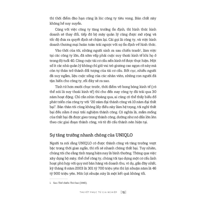 Cuốn sách cũng chỉ ra điểm yếu của các doanh nghiệp Nhật Bản thua trên thương trường thế giới vì đã không phân tích những nguyên nhân dẫn đến thất bại nhỏ. Ông Tadashi Yanai nhấn mạnh sự quan trọng của việc phân tích nguyên nhân thất bại, từ đó suy nghĩ thấu đáo cho chiến lược tiếp theo.