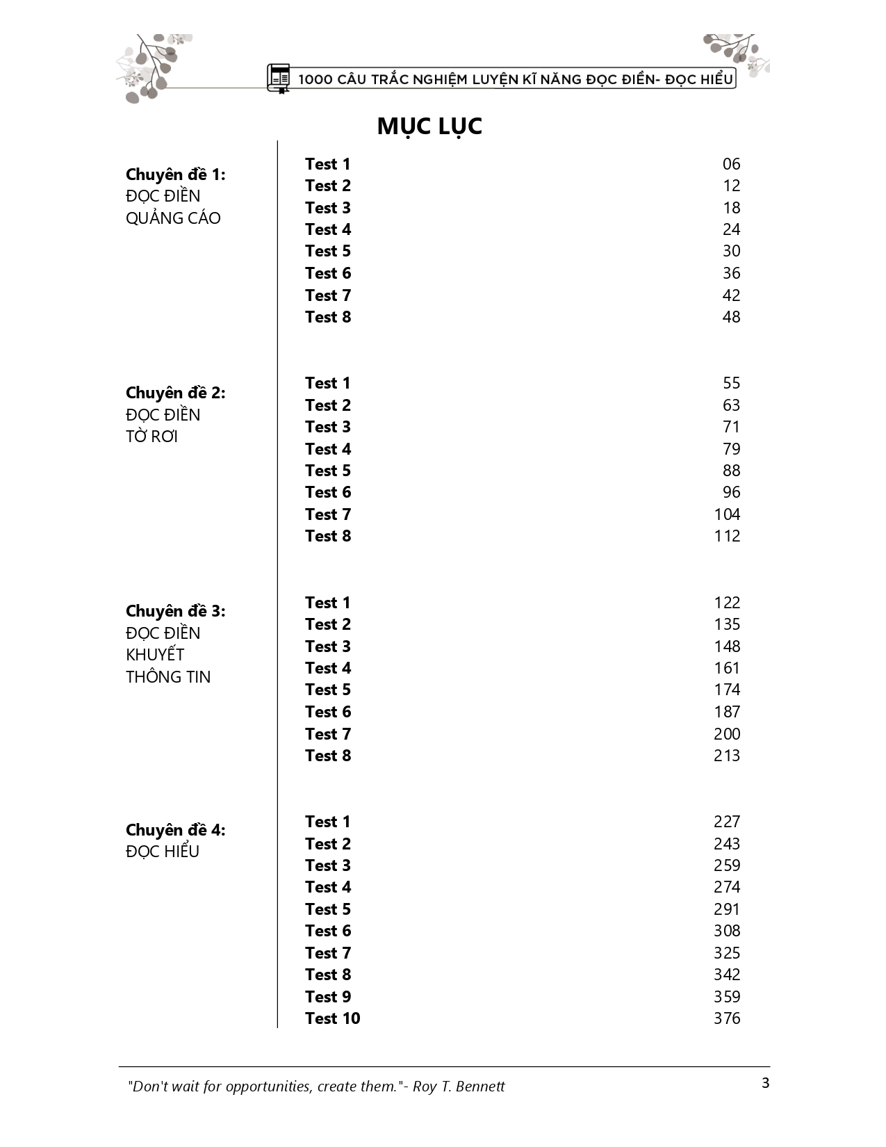 Các kỳ thi Tốt nghiệp THPT Quốc gia và Đánh giá năng lực ngày càng chú trọng vào kỹ năng đọc hiểu, vì vậy việc rèn luyện phương pháp và thực hành thường xuyên là chìa khóa để đạt điểm cao. Cuốn sách "1000 Câu Trắc Nghiệm Luyện Kỹ Năng Đọc Điền – Đọc Hiểu Môn Tiếng Anh" được biên soạn nhằm giúp các em nâng cao kỹ năng này, với hệ thống bài tập đa dạng, bám sát cấu trúc đề thi thực tế. Bố cục sách gồm 4 chuyên đề trọng tâm Chuyên đề 1: Đọc điền quảng cáo Chuyên đề 2: Đọc điền tờ rơi Chuyên đề 3: Đọc điền khuyết thông tin Chuyên đề 4: Đọc hiểu