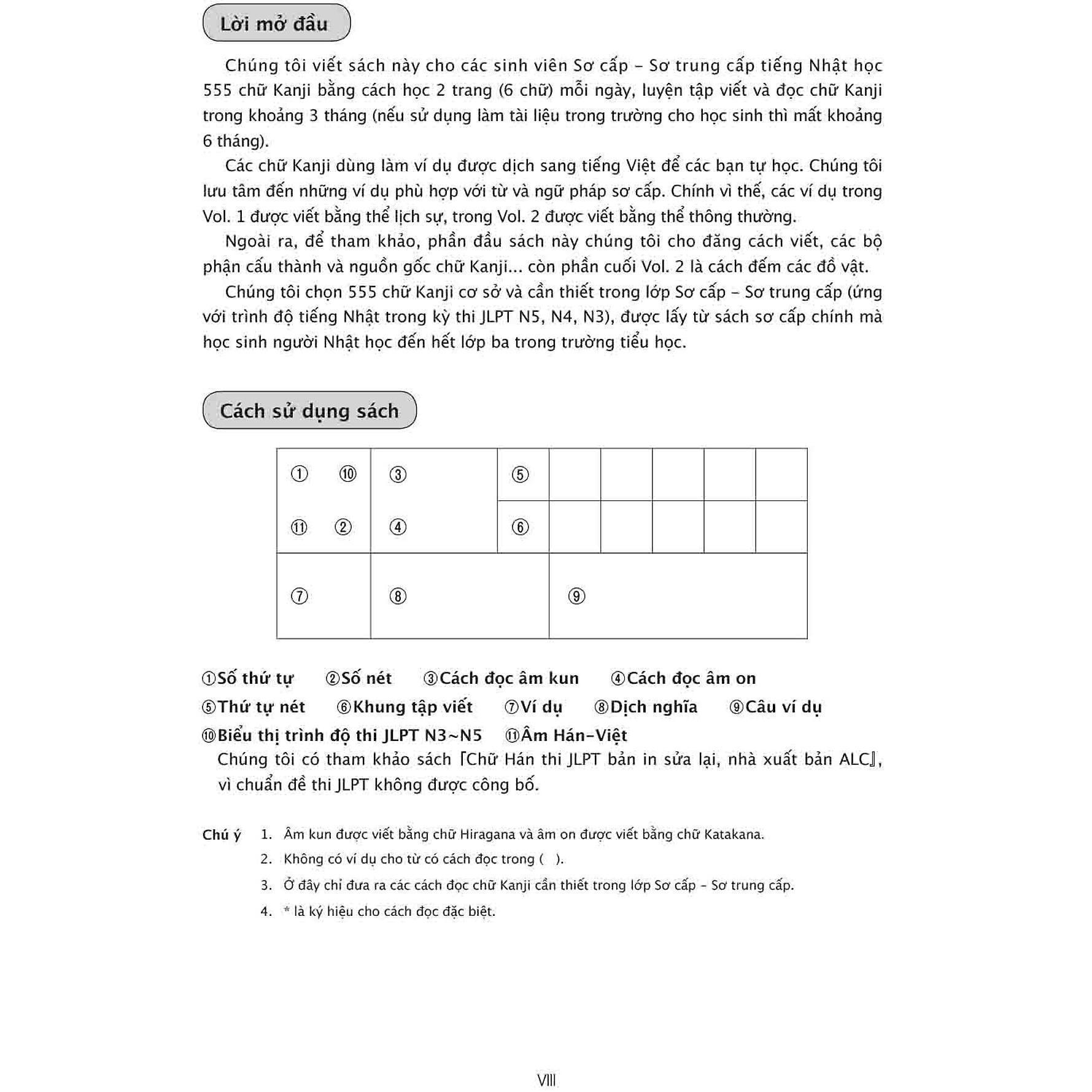 Tập 1,2 này dành cho các học viên Sơ cấp - Sơ trung cấp tiếng Nhật. Hai tập sách cung cấp 555 chữ Hán cơ sở và cần thiết cho trình độ Sơ cấp – Sơ trung cấp, tương ứng với trình độ tiếng Nhật N5, N4, N3 trong kỳ thi JLPT. Những chữ Kanji này cũng được lấy từ sách sơ cấp chính mà học sinh người Nhật học đến hết lớp 3 trong trường tiểu học.