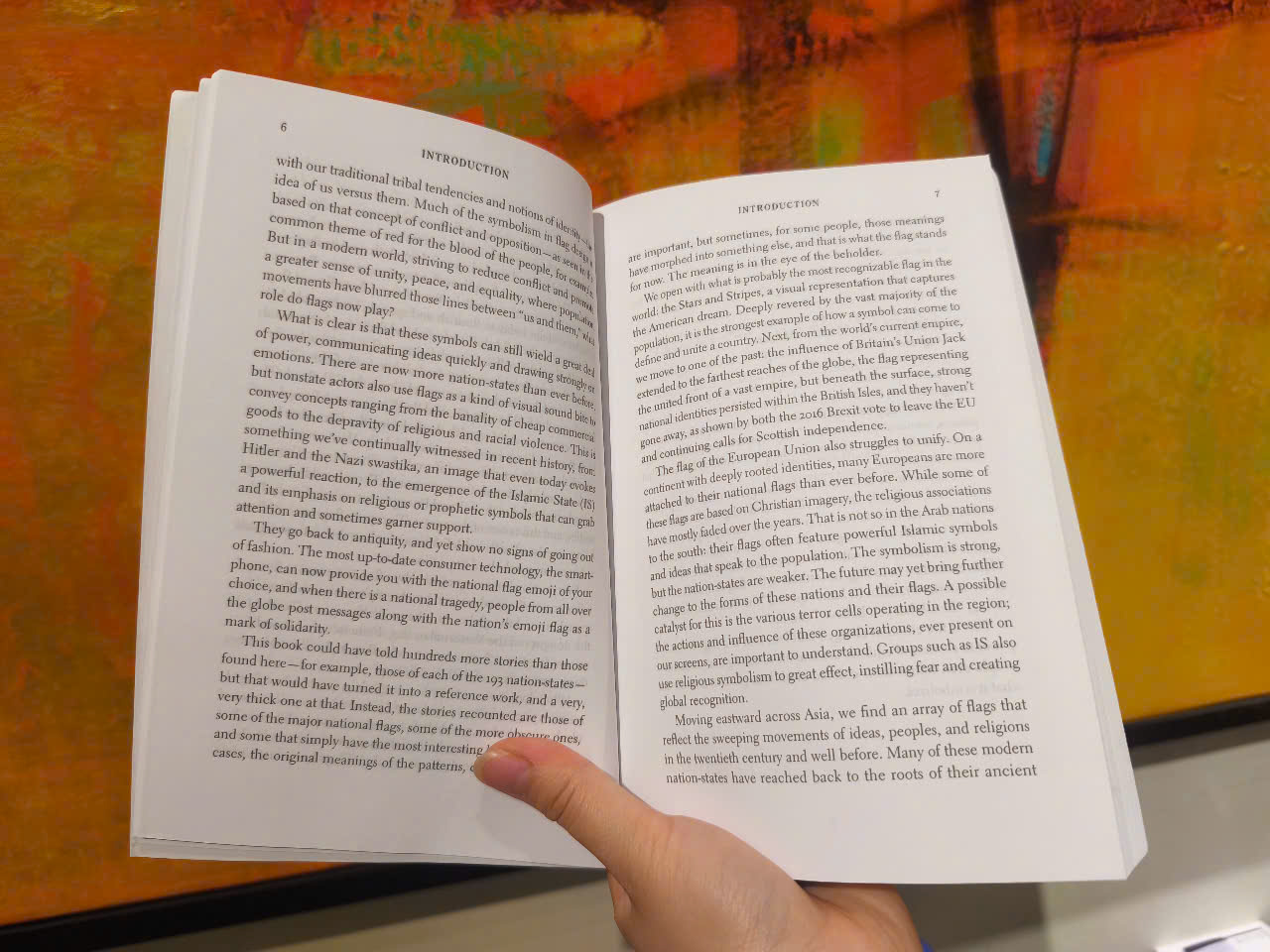Trong hàng nghìn năm, lá cờ đại diện cho hy vọng và ước mơ của chúng ta. Chúng ta vẫy chúng. Đốt chúng. Diễu hành dưới màu cờ của chúng. Và cho đến tận thế kỷ 21, chúng ta vẫn chết vì chúng. Cờ tung bay tại Liên Hợp Quốc, trên các con phố Ả Rập, từ hiên nhà trước nhà ở Texas. Chúng đại diện cho chính trị của các thế lực lớn cũng như chính trị của đám đông. Từ ý thức đổi mới về chủ nghĩa dân tộc ở Trung Quốc, đến bản sắc bất ổn ở Châu Âu và Hoa Kỳ, đến sự trỗi dậy đáng sợ của Nhà nước Hồi giáo, thế giới hiện đang là một nơi hỗn loạn và điều quan trọng là phải hiểu các biểu tượng, cũ và mới, mà mọi người đang tập hợp xung quanh.