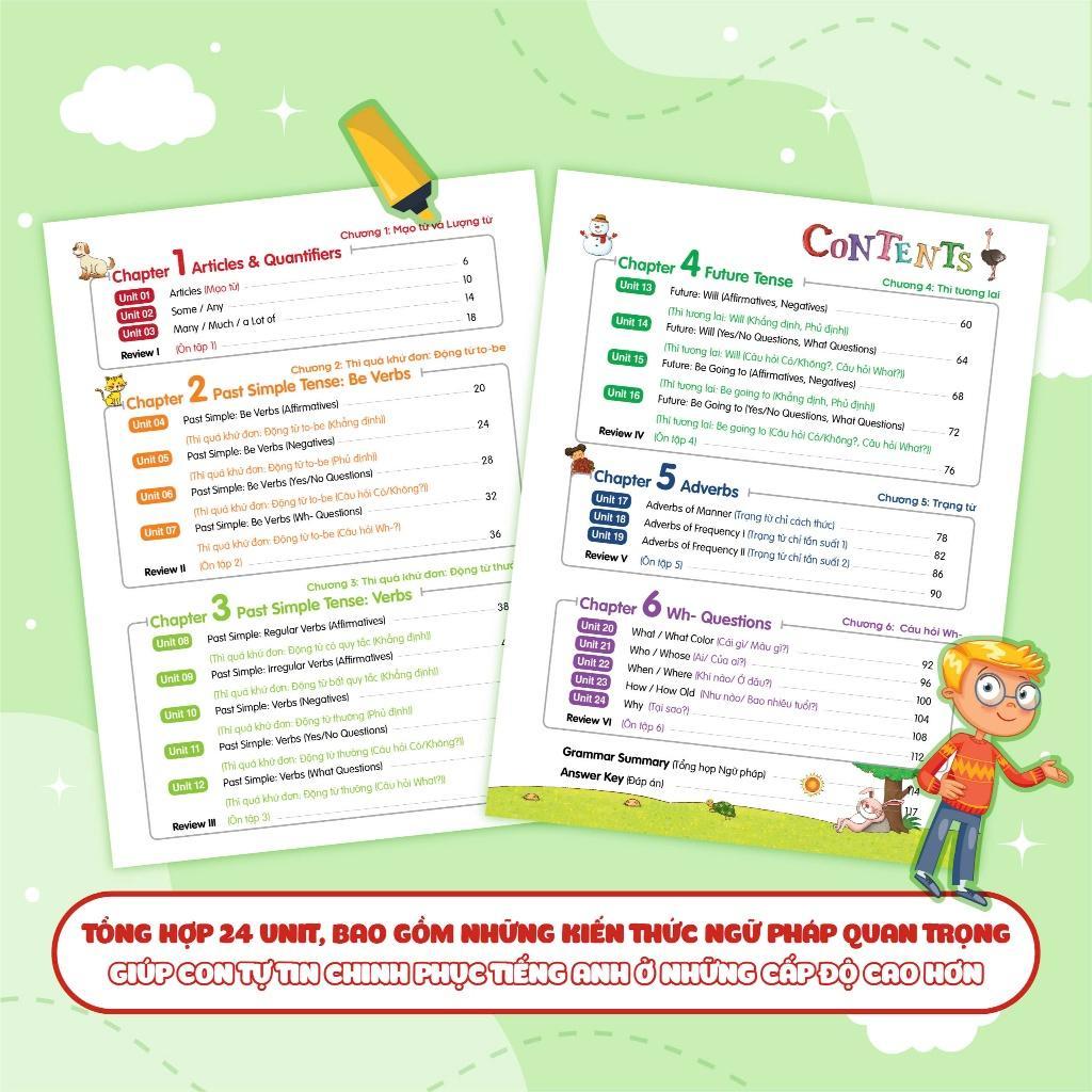 Sách gồm 6 chương với 24 Unit, tổng hợp tất cả những chủ đề ngữ pháp hay nhất trong chương trình lớp 4 như: Danh từ & Mạo từ, Đại từ, động từ To-be, …Những kiến thức ngữ pháp nên tảng vững chắc đầu tiên này sẽ giúp con phát huy tối đa khả năng tiếng Anh khi lên những lớp cao hơn.
