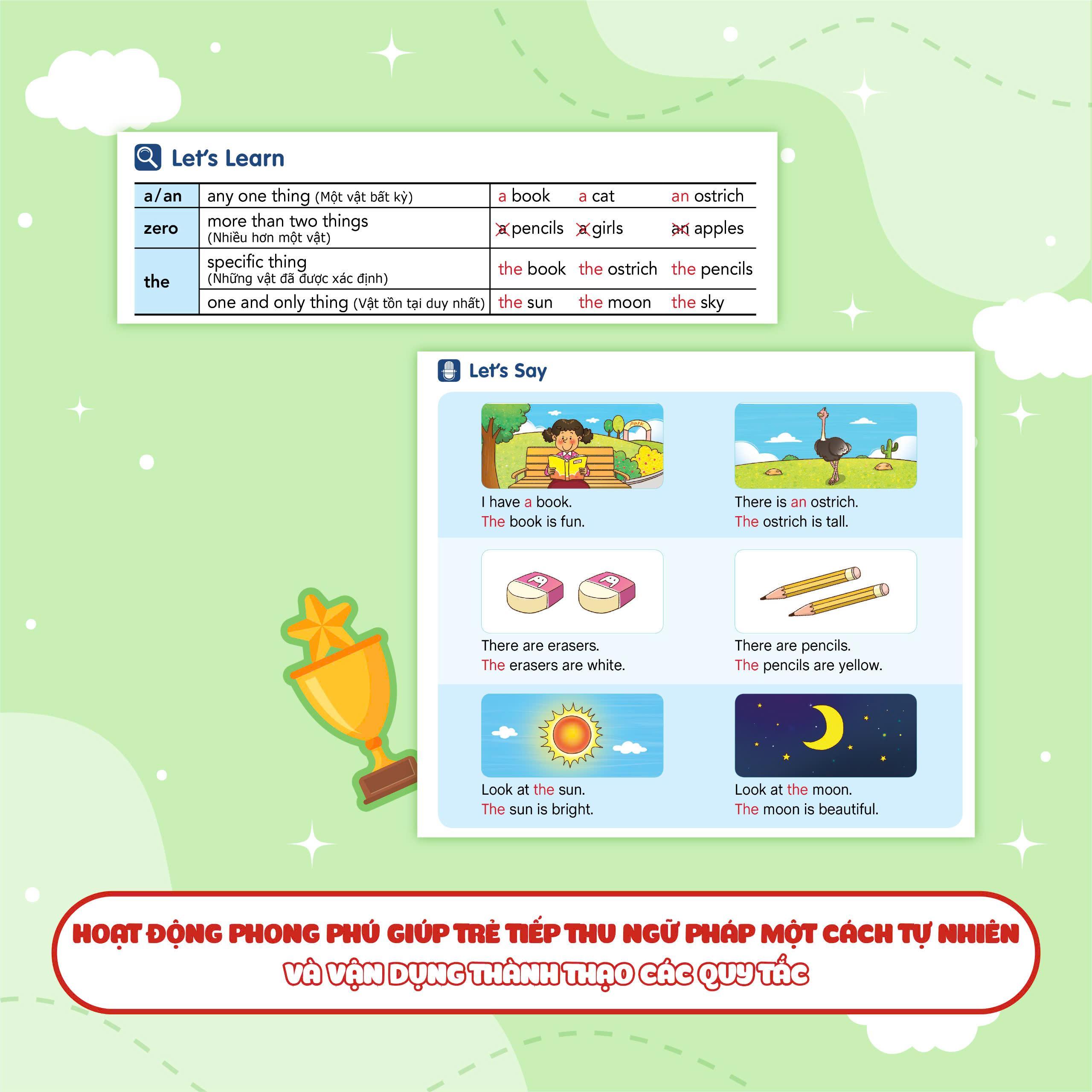 Phần thực hành cung cấp đa dạng các hoạt động, giúp các con tiếp cận từng bước với các quy tắc ngữ pháp. Các con có thể thực hành và tìm hiểu các quy tắc dử dụng ngữ pháp một cách chính xác.