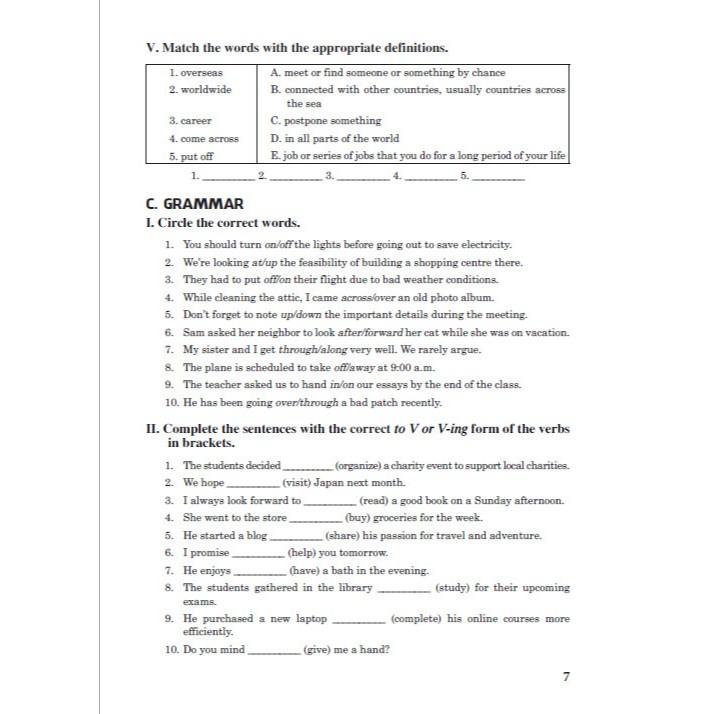 B. Vocabulary: Bao gồm các bài tập về từ vựng