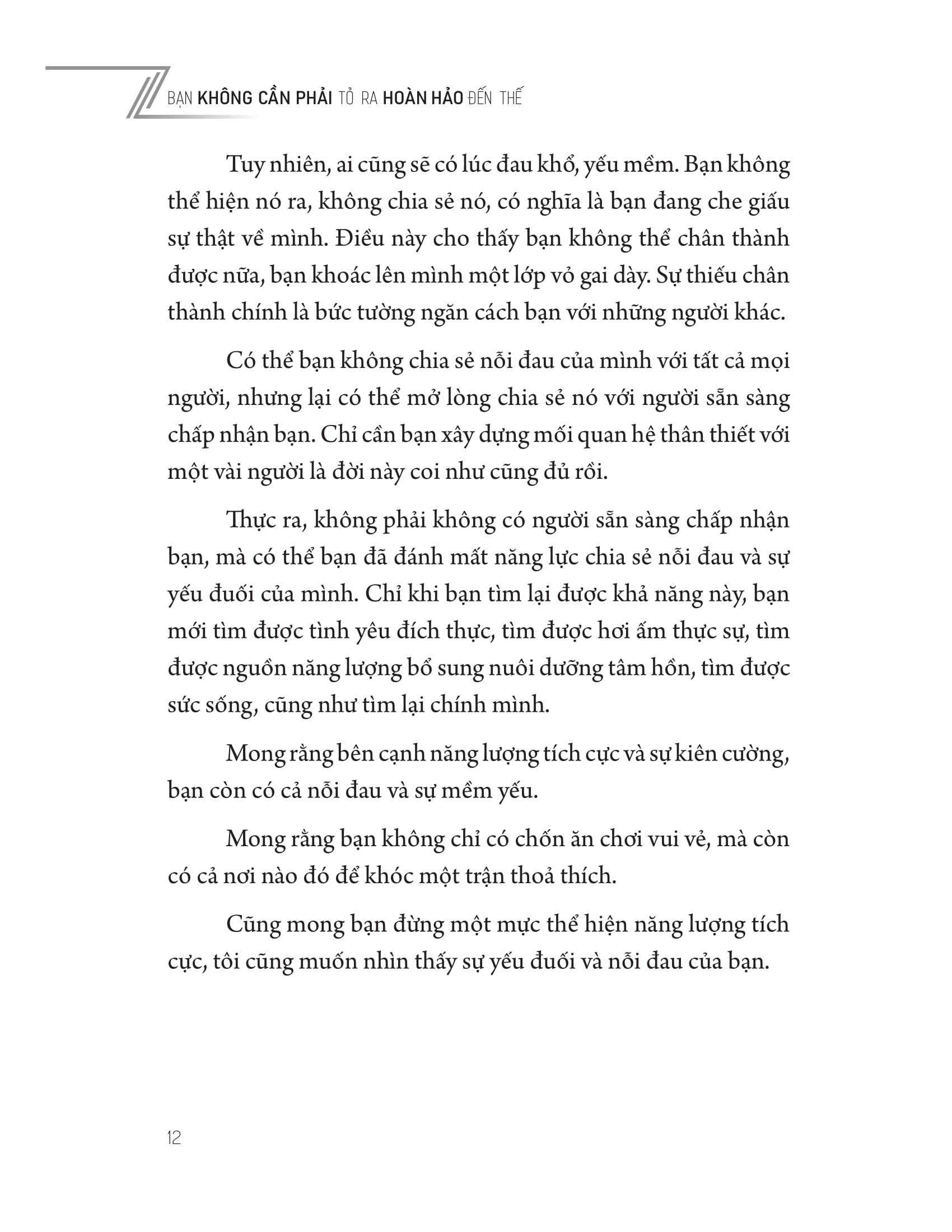 - Cuốn sách này sẽ hỗ trợ bạn thấu hiểu và chia sẻ cảm xúc của m.ình một cách tích cực và chân thành Ai cũng có lúc đau khổ, yếu mềm. Có thể bạn không chia sẻ nỗi đau của m.ình với tất cả mọi người, nhưng chỉ cần bạn xây dựng mối quan hệ với một vài người để bạn đủ tin tưởng chia sẻ những cảm xúc thật của m.ình, đời này coi như cũng đủ rồi. Bạn không cần phải lúc nào cũng thể hiện năng lượng tích cực, đôi khi, hãy chia sẻ cả sự yếu đuối và nỗi đau của bạn. Đó chính là cách để nâng cao mối quan hệ giữa bạn và người bạn tin tưởng, cũng như là để giúp chính bản thân bạn cảm thấy nhẹ nhàng hơn. Cuốn sách Bạn Không Cần Phải Tỏ Ra Hoàn Hảo Đến Thế sẽ hỗ trợ bạn đồng cảm, thấu hiểu và chia sẻ cảm xúc của m.ình một cách tích cực và chân thành; cũng như giúp bạn học cách yêu thươngvà được yêu thương, mở lòng m.ình với đối phương thật chân thực;từ đó bạn sẽ sống một cuộc đời nhẹ nhàng và ý nghĩa hơn! Bạn khôngcần phải tỏ ra hoàn hảo đến thế, hãy cùng học cáchchấp nhận và thương yêu cả những trầy xước của chính m.ình.