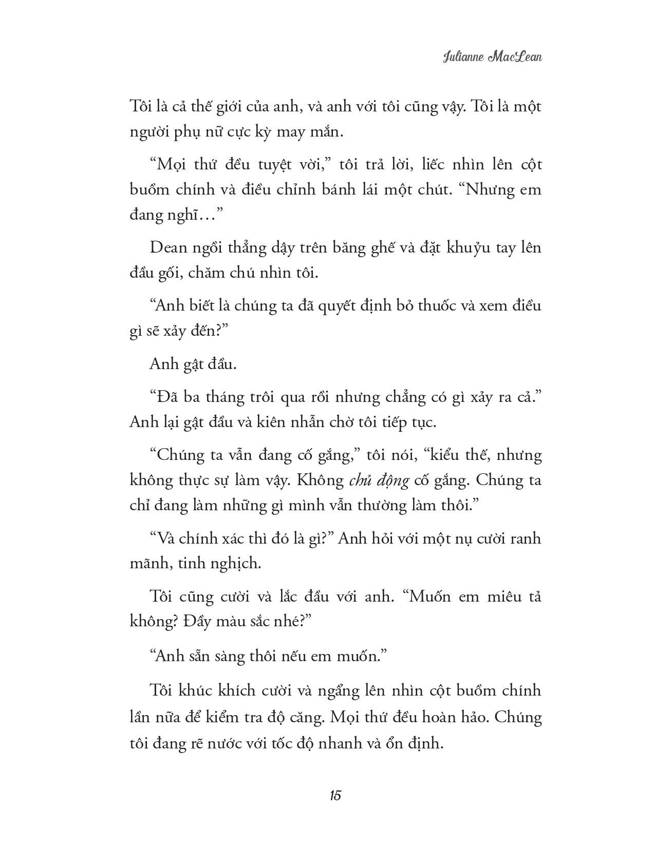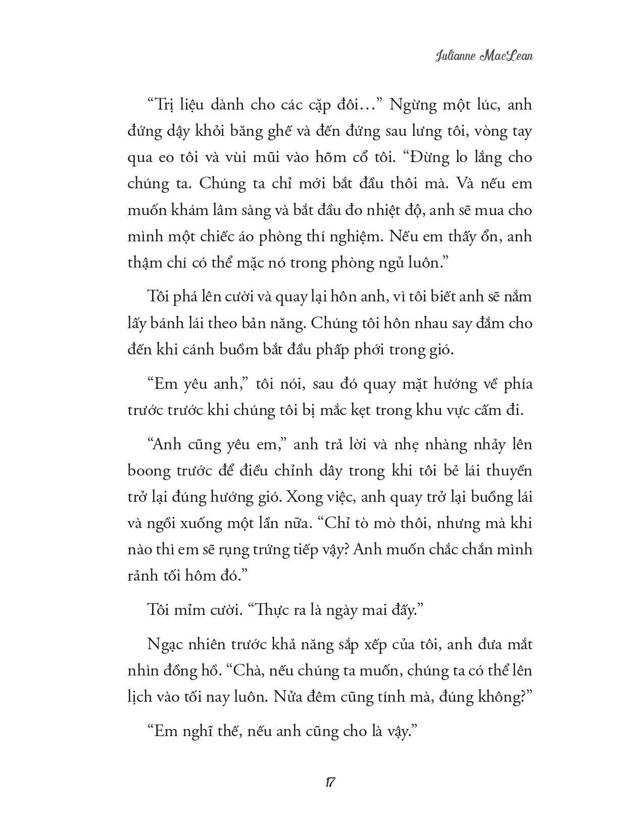 Bên Kia Vùng Biển Sáng Trăng Nội dung chính Olivia Hamilton, một cô gái trong sáng và thuần khiết, như ý nguyện được kết hôn với tình yêu của đời m.ình, Dean, chàng phi công quyến rũ chuyên lái máy bay riêng cho những người giàu có và nổi tiếng. Cuộc sống của họ trôi qua bình dị cho đến một ngày nọ, Dean đột ngột biến mất khi bay ngang qua Tam giác Quỷ Bermuda. Thế giới của Olivia đã hoàn toàn bị đảo lộn. Sau nhiều năm chờ đợi, cuối cùng Olivia cũng phải buông bỏ niềm hy vọng mong manh rằng người chồng yêu dấu của m.ình có thể vẫn còn sống. Melanie Brown là một nhà vật lý học ngày đêm nghiên cứu về bí ẩn của Tam giác Quỷ Bermuda. Nhưng hứng thú nghiên cứu của cô dần mất khi mẹ của cô qua đời trong một tai nạn thương tâm. Để làm lại cuộc đời và cứu vãn sự nghiệp của m.ình, cô quyết định tìm đến một phòng khám tâm lý, và bất ngờ bước vào cuộc tình ngang trái với chính bác sĩ trị liệu của m.ình. Tưởng chừng như cuộc đời của hai người phụ nữ này chẳng liên quan, nhưng họ lại bất ngờ giao nhau ở một điểm. Mối liên hệ kỳ lạ của hai người đã mở ra những bí mật có khả năng thay đổi mọi thứ mà Olivia nghĩ rằng cô ấy biết về cuộc hôn nhân, chồng cô ấy và quan trọng nhất là bản thân cô ấy. Với những khúc ngoặt đầy mê hoặc, Bên kia vùng biển sáng trăng là một cuốn tiểu thuyết sống động, giàu cảm xúc về sức mạnh lay động của tình yêu đánh mất rồi lại tìm thấy - và sức mạnh phi thường của một người phụ nữ đấu tranh cho hạnh phúc sau bi kịch. Tác giả Julianne MacLean là tác giả có sách bán chạy nhất của USA Today với hơn 30 tiểu thuyết, trong đó có bộ sách nổi tiếng Color of Heaven. Độc giả mô tả những cuốn sách của cô ấy là “ngoạn mục”, “có hồn” và “nâng đỡ tinh thần”. MacLean đã bốn lần lọt vào vòng chung kết của giải thưởng RITA dành cho Nhà văn Lãng mạn Hoa Kỳ và đã giành được nhiều giải thưởng, bao gồm Booksellers’ Best Award và Reviewers’ Choice Award của Romantic Times. Tiểu thuyết của cô đã bán được hàng triệu bản trên toàn thế giới và đã được dịch ra hơn 10 loại ngôn ngữ khác nhau. MacLean có bằng Văn học Anh tại King’'s College ở Halifax, Nova Scotia và bằng kinh doanh của Đại học Acadia ở Wolfville, Nova Scotia. Cô ấy thích đi du lịch và đã sống ở New Zealand, Canada và Anh. Cô hiện đang sống ở bờ biển phía đông Canada trong một ngôi nhà ven hồ cùng chồng và con gái.