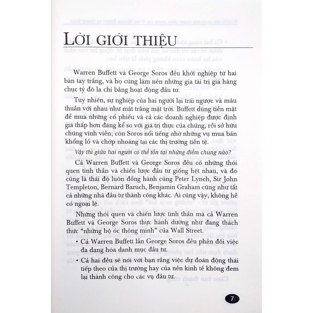 Warren Buffett Và George Soros đều khởi nghiệp từ hai bàn tay trắng, và họ cùng làm nên những gia tài trị giá hàng chục tỷ đô la chỉ bằng một hoạt động đầu tư. Tuy nhiên, sự nghiệp của hai người lại trái ngược và mâu thuẫn với nhau như mặt trăng mặt trời. Buffett dùng tiền mặt để mua những cổ phiếu và cả các doanh nghiệp được định giá thấp hơn đáng kể so với giá trị thực của chúng, rồi sở hữu chúng vĩnh viễn, còn Soros nổi tiếng nhờ những vụ mua bán khổng lồ và chớp nhoáng tại các thị trường tiền tệ.