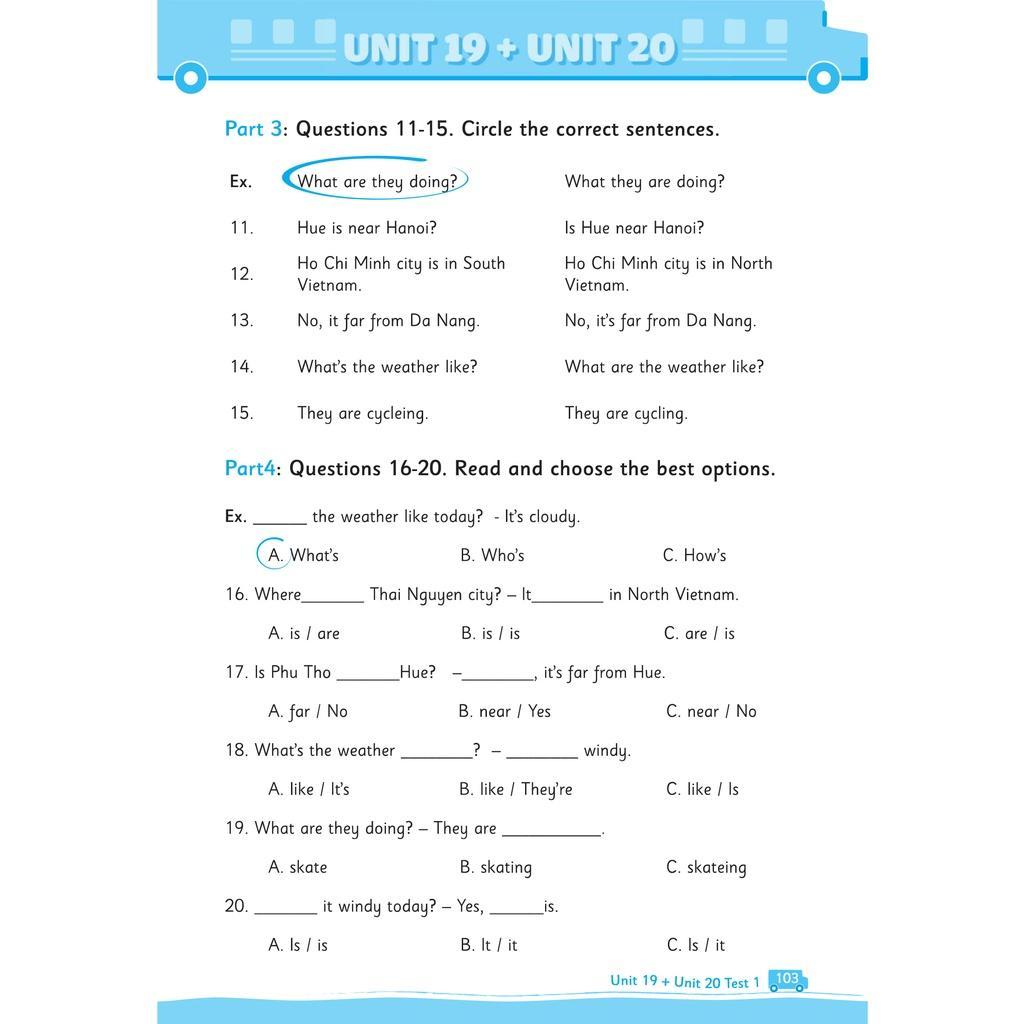 Cứ hai bài sẽ có 2 bài kiểm tra, tất cả các bài kiểm tra đều được thiết kế theo quy định thông tư mới nhất về kiểm tra môn Tiếng Anh tiểu học.