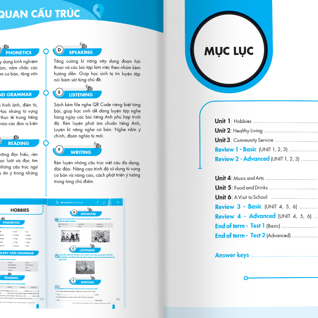 Bộ sách Big 4 - Bộ đề Tự kiểm tra 4 kỹ năng NGHE – NÓI – ĐỌC – VIẾT được biên soạn theo khung chương trình mới của Bộ Giáo dục và Đào tạo nhằm giúp các em học sinh Trung học cơ sở được củng cố và phát triển toàn diện các kỹ năng nghe, nói, đọc, viết tiếng Anh. ĐIỂM NỔI BẬT ĐẶC BIỆT CỦA SÁCH 1. Nội dung được biên soạn một cách khoa học, theo khung chương trình mới nhất của Bộ Giáo dục và Đào tạo Big 4 - Bộ đề Tự kiểm tra 4 kỹ năng NGHE – NÓI – ĐỌC – VIẾT được biên soạn theo chương trình mới của Bộ Giáo Dục và Đào Tạo. Đây là nguồn tài liệu hữu ích cho giáo viên, phụ huynh và các em học sinh bên cạnh bộ sách giáo khoa cơ bản. Cấu trúc của mỗi Unit gồm 6 phần A. Phonetics B. Vocabulary And Grammar C. Reading D. Speaking E. Listening F. Writing 2. Bài tập rèn luyện đa dạng, cơ bản và nâng cao Bài tập được phân chia theo 2 cấp độ, cơ bản và nâng cao. Hệ thống bài tập luyện 4 kỹ năng cơ bản giúp các em ôn tập kiến thức trên lớp; bài tập mở rộng, nâng cao để các em rèn luyện và làm quen với các kì kiểm tra, đánh giá. Các bài tập về 4 kỹ năng được liên kết với nhau theo logic bài học giúp cảm em cảm thấy tự tin và phát triển toàn diện kỹ năng nghe, nói, đọc, viết tiếng Anh 3. File nghe QR code hiện đại và tiện dụng Một điểm đặc biệt của bộ sách đó là tính hiện đại và sự tiện dụng khi các em không cần sử dụng CD để có được bài nghe. Bộ sách được tích hợp mã QR và mã Code giúp các em dễ dàng có được file nghe chỉ với 1 chiếc smartphone, giúp rút ngắn thời gian tìm file 4. Đáp án chi tiết: Hệ thống lời giải chi tiết, các em có thể dễ dàng kiểm tra và đánh giá năng lực bản thân MegaBook hi vọng rằng bộ sách Big 4 bộ đề tự kiểm tra 4 kỹ năng Nghe - Nói - Đọc - Viết tiếng Anh sẽ làm tăng thêm sự tự tin của các em học sinh với khả năng tiếng Anh của bản thân. Công ty phát hành Megabook
