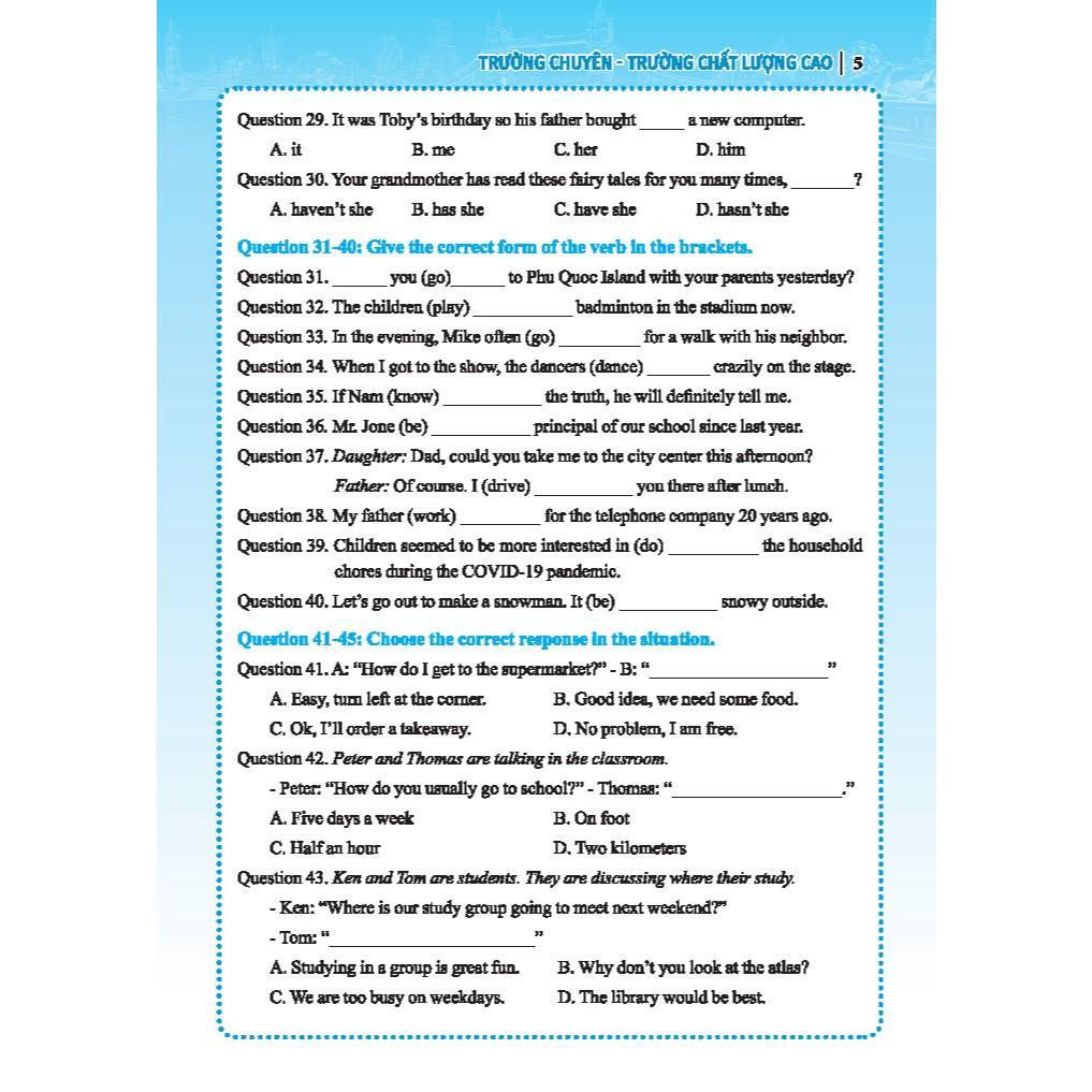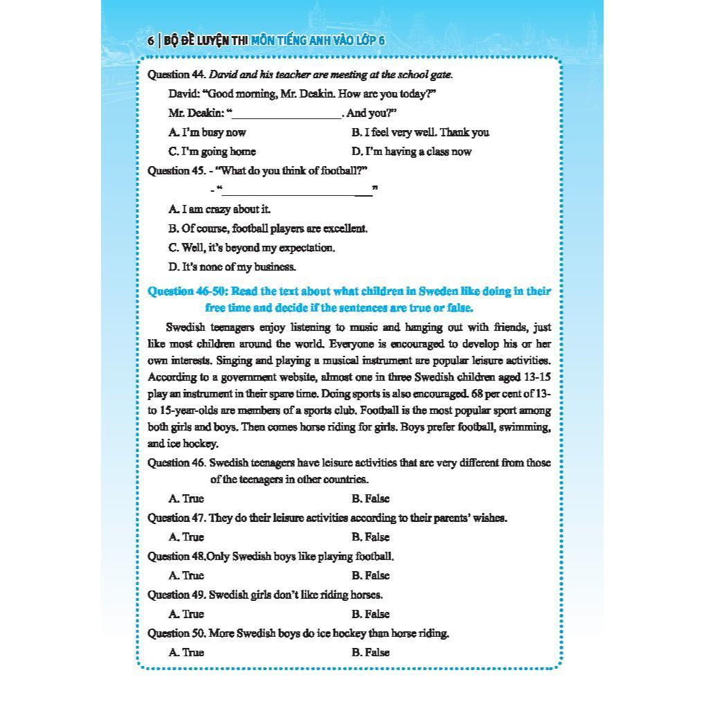 Cuốn “Bộ đề luyện thi môn Tiếng anh vào lớp 6 trường chuyên , chất lượng cao” lần này sẽ là cẩm nang giúp các em rút ngắn khoảng cách và những hạn chế trong hiểu biết của mình để đến với những đề thi vào lớp 6, thi vào các trường huyên, lớp Chọn sát với đề thi chính thức.