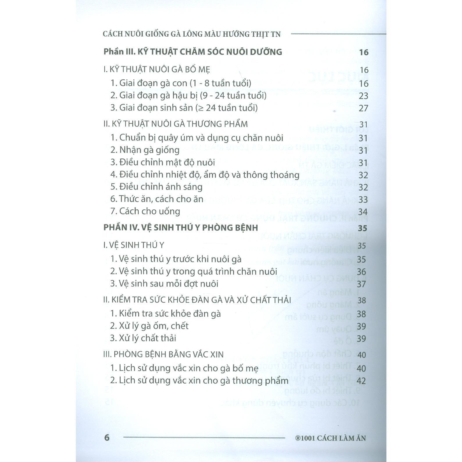Mua tại TiktokCông ty TNHH MTV Nhà xuất bản Nông nghiệp, Ban biên tập và các nhà khoa học, các chuyên gia đã tổ chức biên soạn, xuất bản bộ sách "1001 cách làm ăn" để hướng dẫn cho người dân các kiến thức khoa học, công nghệ phổ thông, ứng dụng khoa học công nghệ mới, dạy nghề, và phổ biến các cách làm ăn thành công. Cuốn sách "Cách Nuôi Giống Gà Lông Màu Hướng Thịt TN" gồm 4 phần;