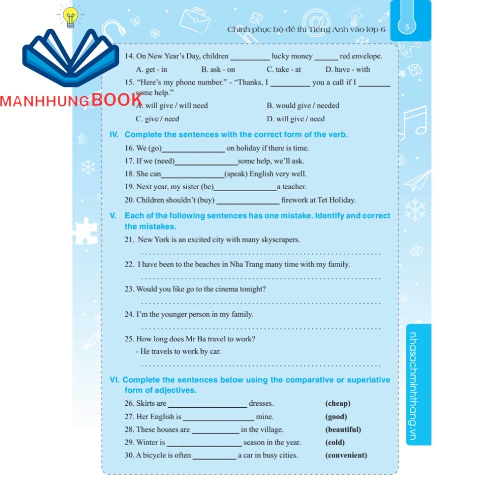 Cuốn “Chinh phục bộ đề thi Tiếng Anh vào lớp 6” lần này sẽ là cẩm nang giúp các em rút ngắn khoảng cách và những hạn chế trong hiểu biết của mình để đến với những đề thi vào lớp 6, thi vào các trường huyên, lớp Chọn sát với đề thi chính thức.