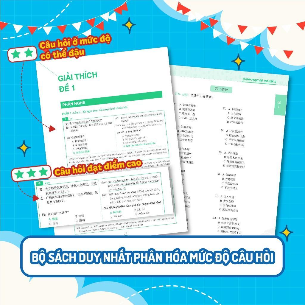 Cuốn sách "Chinh phục đề thi HSK 5" được tổng hợp với 3 bài thi thử, phân tích các câu hỏi được đưa ra trong bài thi HSK gần đây và chọn ra những câu hỏi trọng tâm. Bên cạnh đó cuốn sách cũng giải thích chi tiết các kiến thức cốt lõi trong các đề thi gần nhất với đề thi thật cũng như các câu hỏi học sinh dễ mắc lỗi.