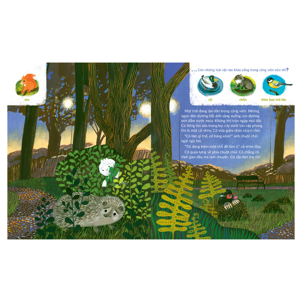 NHÀ NHÍM NƠI CÔNG VIÊN Ở cuốn sách này, sẽ đưa các bạn khám phá môi trường sống của gia đình nhím trong công viên - nơi ẩn chứa nhiều điều thú vị và bất ngờ. Các bạn sẽ được biết đến những thử thách mà hai anh em nhím Patter và Teeny phải đối mặt để sinh tồn trong thế giới đầy rẫy nguy hiểm. Chúng ta sẽ cùng tìm hiểu cách mẹ nhím chăm sóc con non, cách Teeny học hỏi những kỹ năng cần thiết để tự lập và chuẩn bị cho mùa đông khắc nghiệt. Với những bức tranh minh họa sinh động và đẹp mắt, cuốn sách không chỉ khơi gợi trí tưởng tượng và sự tò mò của các bạn nhỏ mà còn mang đến những kiến thức bổ ích về thói quen và lối sống của loài nhím. Qua đó, các bạn sẽ hiểu hơn về thế giới tự nhiên và thêm trân trọng sự đa dạng sinh học của Trái Đất.