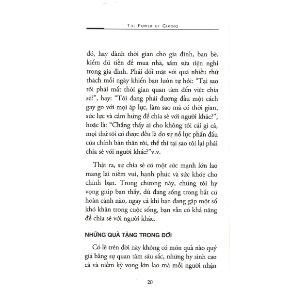 Xuất phát từ chính những trải nghiệm thực tế, đồng thời căn cứ vào kết quả của một số công trình nghiên cứu, hai tác giả đã gợi mở nhiều ý tưởng sâu sắc đáng để người đọc suy ngẫm. Ở đó chúng ta không chỉ thấy được sức mạnh của sự chia sẻ mà còn học được cách chia sẻ. Sự chia sẻ giúp ta tìm được ý nghĩa đích thực của cuộc sống, xoá bỏ trong ta những lo âu, sợ hãi và cảm giác cô đơn, lạc lõng giữa dòng đời. Hơn thế nữa, ta nghiệm ra rằng: cho và nhận đều mang đến hạnh phúc. Cho không có nghĩa là mất đi, mà đó là lúc chúng ra được nhận lại rất nhiều - dưới muôn vàn hình thức khác nhau.
