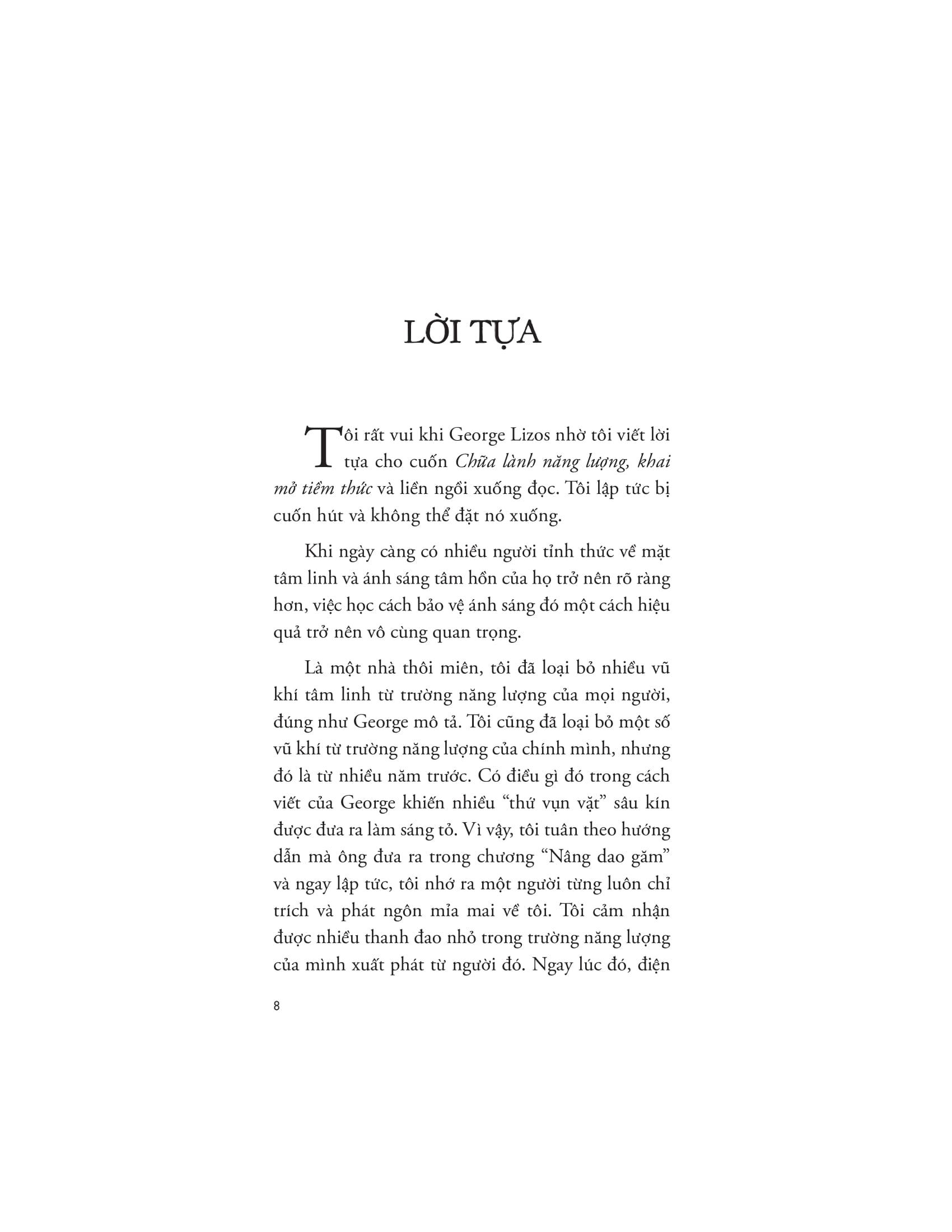 Chữa Lành Năng Lượng, Khai Mở Tiềm Thức Trong thế giới hiện đại, nơi áp lực và tác động từ môi trường ngày càng lớn, chúng ta thường không nhận ra sức mạnh của năng lượng cá nhân – yếu tố quan trọng quyết định sự cân bằng về thể chất, tinh thần và tâm hồn. "Chữa lành năng lượng, khai mở tiềm thức" của George Lizos là một cuốn sách đặc biệt giúp bạn hiểu rõ, bảo vệ và khai phá năng lượng tiềm ẩn bên trong để sống một cuộc đời tích cực, ý nghĩa hơn. Không chỉ mang đến những phương pháp thực tiễn giúp làm sạch và bảo vệ trường năng lượng cá nhân mà đây còn là cuốn sách đầu tiên đề cập đến vấn đề “cuộc tấn công năng lượng” trong môi trường trực tuyến – một khía cạnh vô hình nhưng ảnh hưởng lớn đến cuộc sống ngày nay. Tác giả George Lizos định nghĩa bảo vệ năng lượng là nghệ thuật duy trì suy nghĩ, cảm xúc và hành vi không bị tác động bởi môi trường xung quanh. Sách giới thiệu cách thiết lập ranh giới năng lượng rõ ràng, quản lý tương tác để giữ vững tính xác thực cá nhân. Qua đó bạn sẽ học được cách: • Bảo vệ năng lượng cá nhân: Thiết lập ranh giới rõ ràng để suy nghĩ và cảm xúc không bị tác động bởi năng lượng bên ngoài. • Đối mặt với năng lượng tiêu cực trên mạng xã hội: Sử dụng các phương pháp bảo vệ để duy trì sự cân bằng và bình an khi tương tác trực tuyến. • Làm sạch trường năng lượng: Loại bỏ các gắn kết độc hại và thanh lọc hào quang để cải thiện sức khỏe và tinh thần. • Kích hoạt trực giác: Nhận diện và xử lý các nguồn năng lượng tiêu cực một cách hiệu quả. • Thực hành thiền và nghi thức: Áp dụng các kỹ thuật để che chắn và tăng cường năng lượng tích cực. Cuốn sách không chỉ dành cho những người quan tâm đến tâm linh mà còn là một hướng dẫn thiết thực cho bất kỳ ai muốn cải thiện sức khỏe tinh thần và cảm xúc. Được đánh giá cao từ các chuyên gia hàng đầu, "Chữa Lành Năng Lượng, Khai Mở Tiềm Thức" được xem là tài liệu không thể thiếu để bạn khám phá sức mạnh năng lượng bên trong và sống một cuộc đời trọn vẹn hơn. Về tác giả George Lizos là một giáo viên tâm linh và người chữa lành bằng trực giác, người rất đam mê giúp đỡ những chiến binh ánh sáng thực hiện mục đích tạo ra sự thay đổi tích cực trên thế giới. Ông là tác giả hai cuốn sách bán chạy Lightworker Gotta Work và Be the Guru, người sáng lập ra Intuition Mastery School và là người dẫn chương trình The Lit Up Lightworker Podcast.