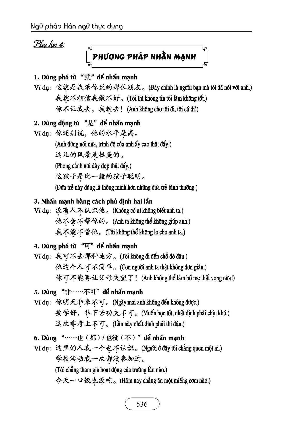 Ngoài ra, sách còn có 6 phụ lục có giá trị, giúp người học củng cố thêm các kiến thức về ngữ pháp tiếng Hán.