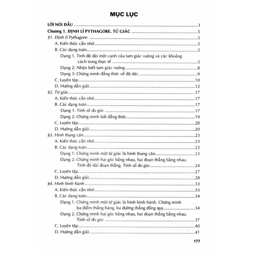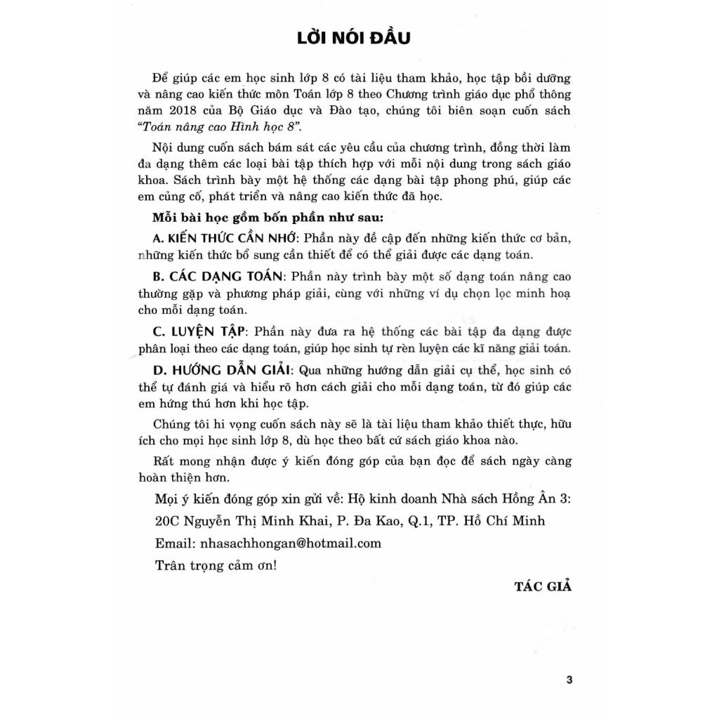 - Toán Nâng Cao Hình Học 8 (Dùng Chung Cho Các Bộ SGK Hiện Hành) Để giúp các em học sinh lớp 8 có tài liệu tham khảo, học tập bồi dưỡng và nâng cao kiến thức môn Toán lớp 8 theo Chương trình giáo dục phổ thông năm 2018 của Bộ Giáo dục và Đào tạo, chúng tôi biên soạn cuốn sách “Toán nâng cao Hình học 8”. Nội dung cuốn sách bám sát các yêu cầu của chương trình, đồng thời làm đa dạng thêm các loại bài tập thích hợp với mỗi nội dung trong sách giáo khoa. Sách trình bày một hệ thống các dạng bài tập phong phú, giúp các em củng cố, phát triển và nâng cao kiến thức đã học. Mỗi bài học gồm bốn phần như sau: A. KIẾN THỨC CẦN NHỚ: Phần này đề cập đến những kiến thức cơ bản, những kiến thức bổ sung cần thiết để có thể giải được các dạng toán. B. CÁC DẠNG TOÁN: Phần này trình bày một số dạng toán nâng cao thường gặp và phương pháp giải, cùng với những ví dụ chọn lọc minh hoạ cho mỗi dạng toán. C. LUYỆN TẬP: Phần này đưa ra hệ thống các bài tập đa dạng được phân loại theo các dạng toán, giúp học sinh tự rèn luyện các kĩ năng giải toán. D. HƯỚNG DẪN GIẢI: Qua những hướng dẫn giải cụ thể, học sinh có thể tự đánh giá và hiểu rõ hơn cách giải cho mỗi dạng toán, từ đó giúp các em hứng thú hơn khi học tập. Chúng tôi hi vọng cuốn sách này sẽ là tài liệu tham khảo thiết thực, hữu ích cho mọi học sinh lớp 8, dù học theo bất cứ sách giáo khoa nào. Rất mong nhận được ý kiến đóng góp của bạn đọc để sách ngày càng hoàn thiện hơn. Công ty phát hành: Nhà Sách Hồng Ân 3 Năm Xuất Bản: 2024 Tác Giả: Nguyễn Thiện Chí Kích Thước: 17 x 24 cm Nhà Xuất bản: Đại Học Sư Phạm Số Trang: 180 Bìa: Mềm Barcode8935092836966