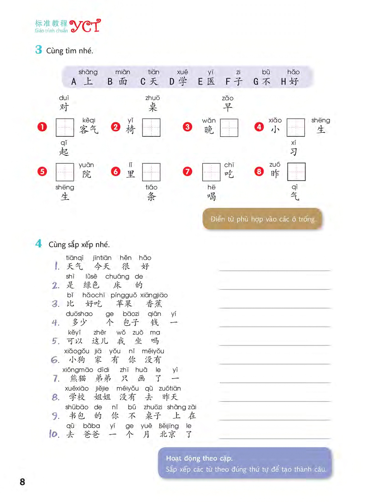 Nội dung sách: Sách YCT là sách tiếng hoa thiếu nhi bản quyền chuẩn mẫu chương trình dạy cho các bé từ vở lòng bằng những bài học đơn giản nhất. Giáo Trình Chuẩn YCT 1 (kèm 1CD nghe) Mã hàng 9786045877289 Nhà Phát Hành Cty Nhân Trí Việt Tác giả Tô Anh Hà, Kim Phi Phi, Vương Lôi Người Dịch Tiến sĩ Nguyễn Thị Minh Hồng Nhà xuất bản: Tổng Hợp TPHCM Năm XB 2018 Trọng lượng (gr) 100 Kích Thước Bao Bì 21 x 28.5 cm Số trang 68 Hình thức Bìa Mềm     Giáo Trình Chuẩn YCT 2 (NGHE qua QUÉT MẢ QR) Mã hàng 9786045877296 Nhà Phát Hành Cty Nhân Trí Việt Tác giả Tô Anh Hà, Vương Lôi Người Dịch Tiến sĩ Nguyễn Thị Minh Hồng Nhà xuất bản: Tổng Hợp TPHCM Năm XB 2018 Ngôn Ngữ Tiếng Trung Trọng lượng (gr) 100 Kích Thước Bao Bì 28.5 x 21 x 0.5 cm Số trang 76 Hình thức Bìa Mềm   Giáo Trình Chuẩn YCT 3 (kèm 1CD nghe) Mã hàng 9786045877302 Nhà Phát Hành Cty Nhân Trí Việt Tác giả Tô Anh Hà, Vương Thục Hồng, Hách Lâm Người Dịch Tiến sĩ Nguyễn Thị Minh Hồng Nhà xuất bản: Tổng Hợp TPHCM Năm XB 2018 Trọng lượng (gr) 100 Kích Thước Bao Bì 21 x 28.5 cm Số trang 74 Hình thức Bìa Mềm   Giáo Trình Chuẩn YCT 4 (CD) Mã hàng 9786045877319 Nhà Phát Hành Cty Nhân Trí Việt Tác giả Tô Anh Hà, Vương Thục Hồng, Giải Hồng Người Dịch Tiến sĩ Nguyễn Thị Minh Hồng Nhà xuất bản: Tổng Hợp TPHCM Năm XB 2018 Trọng lượng (gr) 100 Kích Thước Bao Bì 21 x 28.5 cm Số trang 74 Hình thức Bìa Mềm     Giáo Trình Chuẩn YCT 5 (kèm 1CD nghe)   Mã hàng 9786045877326 Nhà Phát Hành Cty Nhân Trí Việt Tác giả Tô Anh Hà, Vương Văn Long, Vương Lôi Người Dịch Tiến sĩ Nguyễn Thị Minh Hồng Nhà xuất bản: Tổng Hợp TPHCM Năm XB 2018 Trọng lượng (gr) 150 Kích Thước Bao Bì 21 x 28.5 cm Số trang 138 Hình thức Bìa Mềm   Giáo Trình Chuẩn YCT 6 (kèm 1CD nghe)   Mã hàng 9786045877333 Nhà Phát Hành Cty Nhân Trí Việt Tác giả Tô Anh Hà, Vương Lôi Người Dịch Tiến sĩ Nguyễn Thị Minh Hồng Nhà xuất bản: Tổng Hợp TPHCM Năm XB 2018 Trọng lượng (gr) 150 Kích Thước Bao Bì 21 x 28.5 cm Số trang 142 Hình thức Bìa Mềm