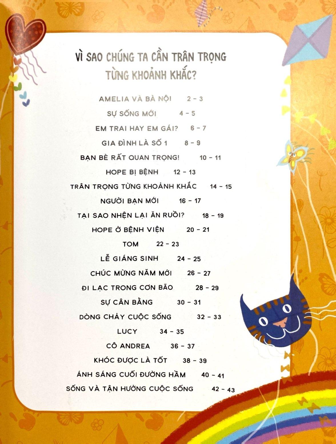 Các sự kiện xảy ra hằng ngày, chẳng hạn như được sinh ra, đổ bệnh và qua đời, là một trong những phần thiết yếu của cuộc sống. Trong cuốn sách Cuộc sống mến thương, nhờ câu chuyện của Amelia và những sự kiện đặc biệt đã xảy ra, các bạn nhỏ sẽ học được tầm quan trọng của việc lắng nghe những cảm xúc nội tâm như buồn rầu, giận dỗi và hạnh phúc.
