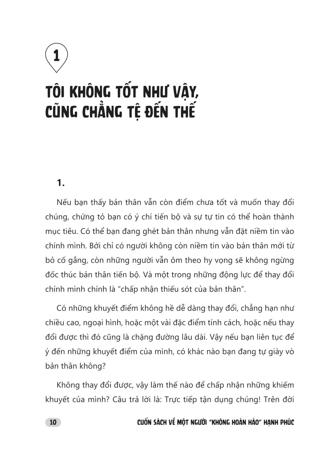 Cuốn sách về một người “không hoàn hảo” hạnh phúc mang đến những hiểu biết sâu sắc về bản chất con người; bộc lộ vô vàn mâu thuẫn, bất an của một thế giới hào nhoáng đẹp đẽ. Thông qua các góc nhìn độc đáo của tác giả, bạn sẽ được khám phá một cách trực tiếp và làm sáng tỏ nhiều khía cạnh khác nhau trong cuộc sống: tương lai, mối quan hệ, gia đình,… những điều mà bạn đang phải chật vật đối mặt.