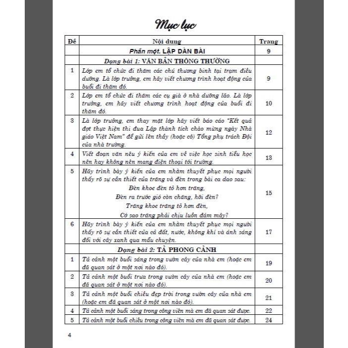 Cuốn sách Dàn bài tập làm văn 5 được biên soạn nhằm giúp các em học sinh lớp 5 học tốt phân môn Tập làm văn, từ đó thuận lợi hơn trong học tập môn Tiếng Việt. Ngoài những đề tập làm văn theo quy định trong sách giáo khoa, tác giả đưa thêm vào nhiều bài ngoài chương trình theo chủ đề đã học để các em tham khảo. Nhờ vậy, sách không chỉ giúp các em nắm vững kiến thức cơ bản về tập làm văn mà các em còn được mở rộng và nâng cao hơn sự hiểu biết về phân môn này.
