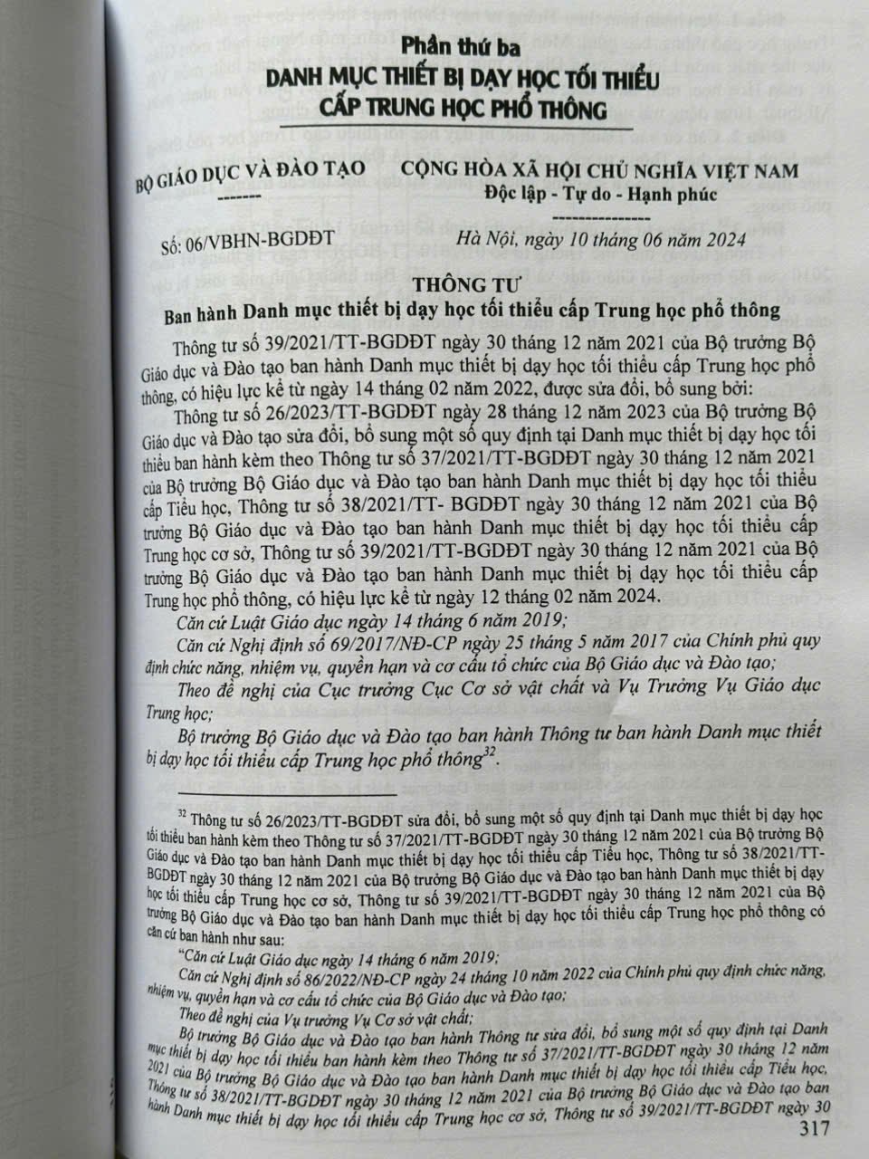 – Văn bản hợp nhất số: 06/VBHN-BGDĐT ngày 10 tháng 06 năm 2024 của Bộ Giáo dục và Đào tạo hợp nhất Thông tư về Danh mục thiết bị dạy học tối thiểu cấp Trung học phổ thông.