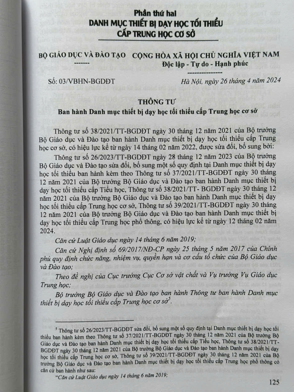 – Văn bản hợp nhất 03/VBHN-BGDĐT ngày 26 tháng 4 năm 2024 của Bộ Giáo dục và Đào tạo hợp nhất Thông tư về Danh mục thiết bị dạy học tối thiểu cấp Trung học cơ sở;