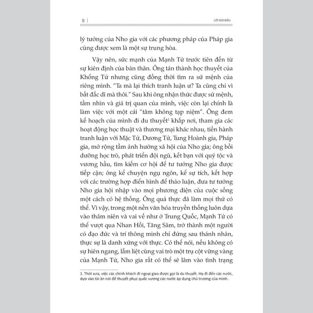 Mạnh Tử rất giỏi hùng biện, ông đã giảng một cách thấu đáo và sinh động về mệnh đề rộng lớn là “Tu thân, tề gia, trị quốc, bình thiên hạ”. Đồng thời ông cũng thể hiện được trải nghiệm sâu sắc và nhạy bén trong cách đối nhân xử thế tài tình của mình. Cho dù hiện tại, bạn đang tự mình kiên trì trên đường đời hay tạm thời lạc lối trước bước ngoặt của số phận, bạn sẽ có được phương hướng và dũng khí để tiếp tục tiến về phía trước thông qua cuốn sách này.