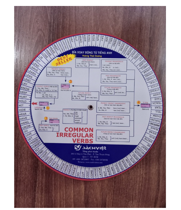 Đĩa Xoay Động Từ Tiếng Anh giúp bạn dễ dàng ghi nhớ những động từ cơ bản trong tiếng Anh cùng với các hình thức thích hợp của nó (Hiện tại đơn, quá khứ đơn, hoàn thành, V-ing).