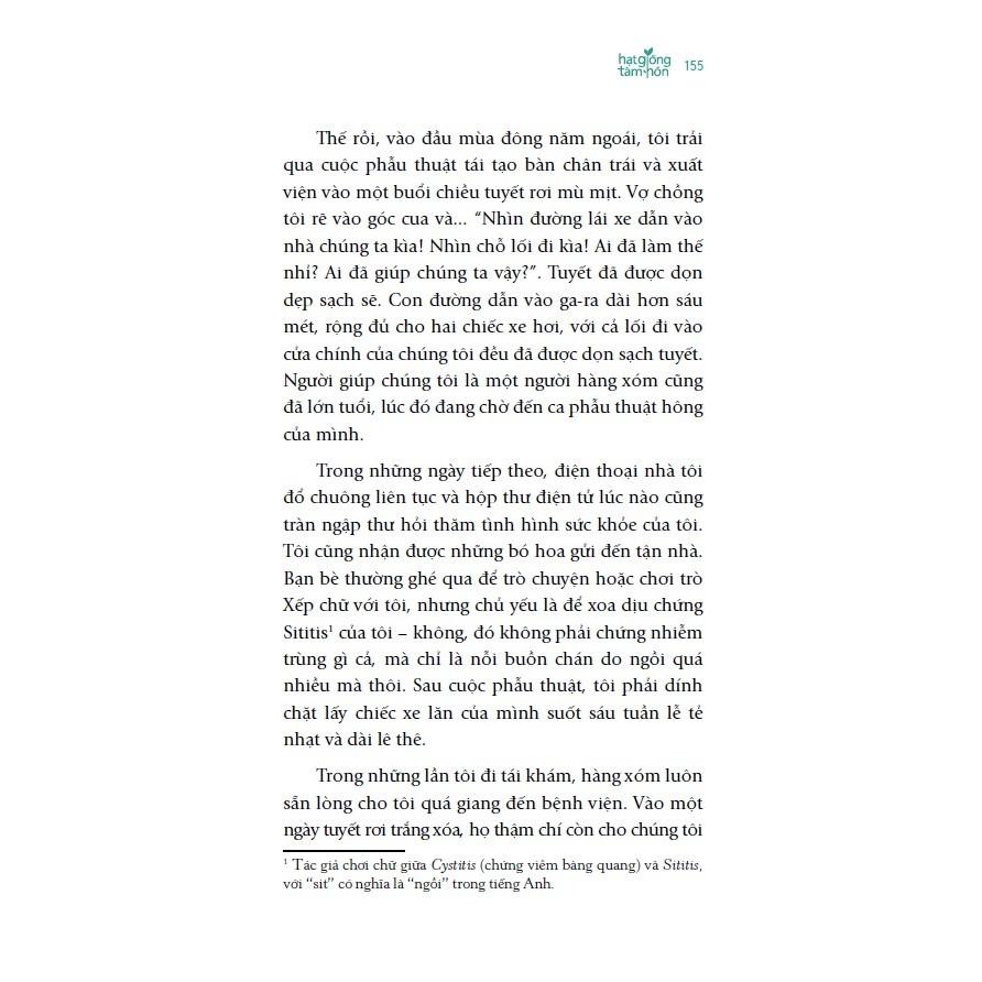 - Suy nghĩ tử tế, thái độ tử tế, hành động tử tế để hạnh phúc trọn vẹn - Bạn có nghĩ một hành động nhỏ của mình có thể thay đổi cuộc đời của một người nào đó không, hoặc… ngược lại? Ở thời đại mà những tin tức xã hội tiêu cực tràn ngập mặt báo, các chủ đề về bạo lực, chiến tranh hay tiêu đề giật gân về đời sống riêng tư của người nổi tiếng lại là từ khóa được nhiều người tìm kiếm, thật khó để tin rằng thế giới này vẫn còn tồn tại tình yêu thương, sự tử tế hay những hành động giúp đỡ vô điều kiện giữa người với người. Dù vậy, tử tế vẫn là một trong những điều tốt đẹp nhất mà chúng ta có thể trao cho nhau. Sự tử tế không nhất thiết phải là những việc quá lớn lao, mà chúng có thể bắt nguồn từ những hạt mầm bé nhỏ được ta “gieo trồng” mỗi ngày. Đó có thể chỉ là những hành động đơn giản và ngẫu nhiên, nhưng theo thời gian, với “sự chăm bón” đúng cách, chúng có thể tạo nên những thay đổi lớn lao không chỉ cho mỗi cá nhân mà còn cho cộng đồng và thế giới. Đây cũng chính là thông điệp nhân văn mà quyển sách “Gieo Hạt Mầm Tử Tế” mang đến cho độc giả. Quyển sách gồm 27 câu chuyện đời thường đầy gần gũi và cảm động nói về lòng tốt và sự tử tế trong cuộc sống. Với văn phong giản dị nhưng không kém phần sâu sắc, “Gieo Hạt Mầm Tử Tế” khiến bạn cảm nhận được tình yêu thương vẫn luôn tồn tại dù cuộc đời này có khắc nghiệt đến đâu đi nữa. Và bạn sẽ nhận ra rằng khi bạn dịu dàng với thế giới này, bạn cũng sẽ nhận lại sự dịu dàng từ thế giới. Nối tiếp chủ đề ý nghĩa về sự tử tế của Bộ sách Hạt Giống Tâm Hồn, “Gieo Hạt Mầm Tử Tế” không mang đến những câu chuyện truyền cảm hứng về cuộc đời của một vĩ nhân hay một người nổi tiếng nào, mà quyển sách chứa đựng những câu chuyện bình dị mà ta dễ dàng bắt gặp trong cuộc sống hằng ngày. Đó có thể là câu chuyện của cậu bé Arthur cực kỳ thông minh nhưng mắc chứng tự kỷ sẵn sàng nhường đĩa bánh tiramisu yêu thích cho một người ăn xin bên đường. Hay câu chuyện về bác tài xế Mike tốt bụng cho hai cô sinh viên bị hỏng xe đi nhờ một đoạn đường giữa đêm bão tuyết, nhờ vậy mà vô tình cứu hai cô gái thoát khỏi vụ tai nạn kinh hoàng chỉ vài phút sau đó. Và còn nhiều câu chuyện nhân văn giàu ý nghĩa khác sẽ chạm đến trái tim bạn. Những cung bậc cảm xúc len lỏi trên từng trang sách sẽ giúp bạn nhận ra cuộc sống vốn muôn màu muôn vẻ. Mỗi người mà ta gặp trên đường đời này không ai là ngẫu nhiên và những hành động tử tế của bạn dành cho họ không điều gì là vô ích. Cũng trong quyển sách này, bạn sẽ bắt gặp được hình ảnh của chính mình, của những người xung quanh, hoặc đứng ở vị trí “người ngoài cuộc” để chiêm nghiệm, khám phá những điều thật sự ý nghĩa và tìm ra châm ngôn sống cho chính mình. Khép lại quyển sách “Gieo Hạt Mầm Tử Tế”, hy vọng bạn sẽ có thêm động lực để yêu thương bản thân và những người xung quanh bằng cách giúp đỡ mọi người, ngay cả khi đó là một hành động nhỏ. Hy vọng những hạt mầm tử tế từ những việc nhỏ này sẽ được gieo trong tâm hồn bạn, để từ đó được bạn vun trồng, tưới mát rồi có một ngày bạn sẽ nhận được quả ngọt mà hạt mầm nhỏ ấy mang lại. Về tác giả Amy Newmark là tác giả sách bán chạy, Tổng biên tập của bộ sách “Chicken Soup for the Soul”. Kể từ năm 2008, bà đã xuất bản 190 tựa sách mới cho “Chicken Soup for the Soul”, hầu hết đều bán chạy tại Hoa Kỳ và Canada. Amy Newmark được ghi nhận là người làm hồi sinh “Chicken Soup for the Soul” - thương hiệu nổi tiếng khắp thế giới, ra mắt lần đầu tiên vào năm 1993. Để làm được điều này, Amy đã tuyển chọn và biên soạn những câu chuyện có thật đầy cảm hứng - từ những con người bình thường có trải nghiệm phi thường. Qua đó, Amy giúp thương hiệu lâu đời “Chicken Soup for the Soul” luôn giữ được tính mới mẻ và phù hợp với độc giả ngày nay. Về tủ sách Hạt Giống Tâm Hồn: Năm 2002, First News cho ra mắt cuốn sách đầu tiên trong tủ sách “Hạt Giống Tâm Hồn”. Tủ sách được phát triển từ triết lý gieo hạt giống niềm tin, lòng can đảm, đức độ, khát vọng và tình yêu cuộc sống. Liên tục trong hơn 20 năm qua, Hạt Giống Tâm Hồn đã ra mắt bạn đọc với trên 300 tựa sách, tập hợp những câu chuyện ý nghĩa, cảm động về tình yêu thương vô bờ bến, nghị lực vươn lên trong cuộc sống, đức hy sinh cao cả. Những câu chuyện gần gũi, cảm động và giàu tính nhân văn trong tủ sách là nguồn động viên tinh thần cho hàng triệu độc giả, giúp họ vượt qua những khó khăn, thử thách, theo đuổi ước mơ và vươn tới một cuộc sống tốt đẹp hơn. Tủ sách Hạt Giống Tâm Hồn luôn đứng đầu các bảng xếp hạng sách được bạn đọc y