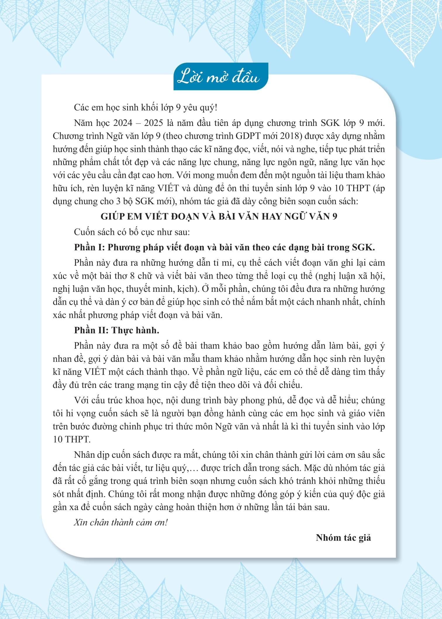 Mua tại TiktokGiúp Em Viết Đoạn Và Bài Văn Hay Ngữ Văn Lớp 9 Giúp em viết đoạn và bài văn hay Ngữ Văn Lớp 9 giúp học sinh thành thạo các kĩ năng đọc, viết, nói và nghe, tiếp tục phát triển những phẩm chất tốt đẹp và các năng lực chung, năng lực ngôn ngữ, năng lực văn học với các yêu cầu cần đạt cao hơn. Với mong muốn đem đến một nguồn tài liệu tham khảo hữu ích, rèn luyện kĩ năng VIẾT và dùng để ôn thi tuyển sinh lớp 9 vào 10 THPT (áp dụng chung cho 3 bộ SGK mới), đây sẽ người bạn đồng hành thân thiết, giúp các em học tốt môn Ngữ Văn lớp 9 và đạt điểm cao trong kì thi vào lớp 10. ƯU ĐIỂM VƯỢT TRỘI CỦA CUỐN SÁCH GIÚP EM VIẾT ĐOẠN VÀ BÀI VĂN HAY NGỮ VĂN LỚP 9 Sách tham khảo cho 3 bộ SGK hiện hành, bám sát chương trình giáo dục phổ thông mới của Bộ GD&ĐT