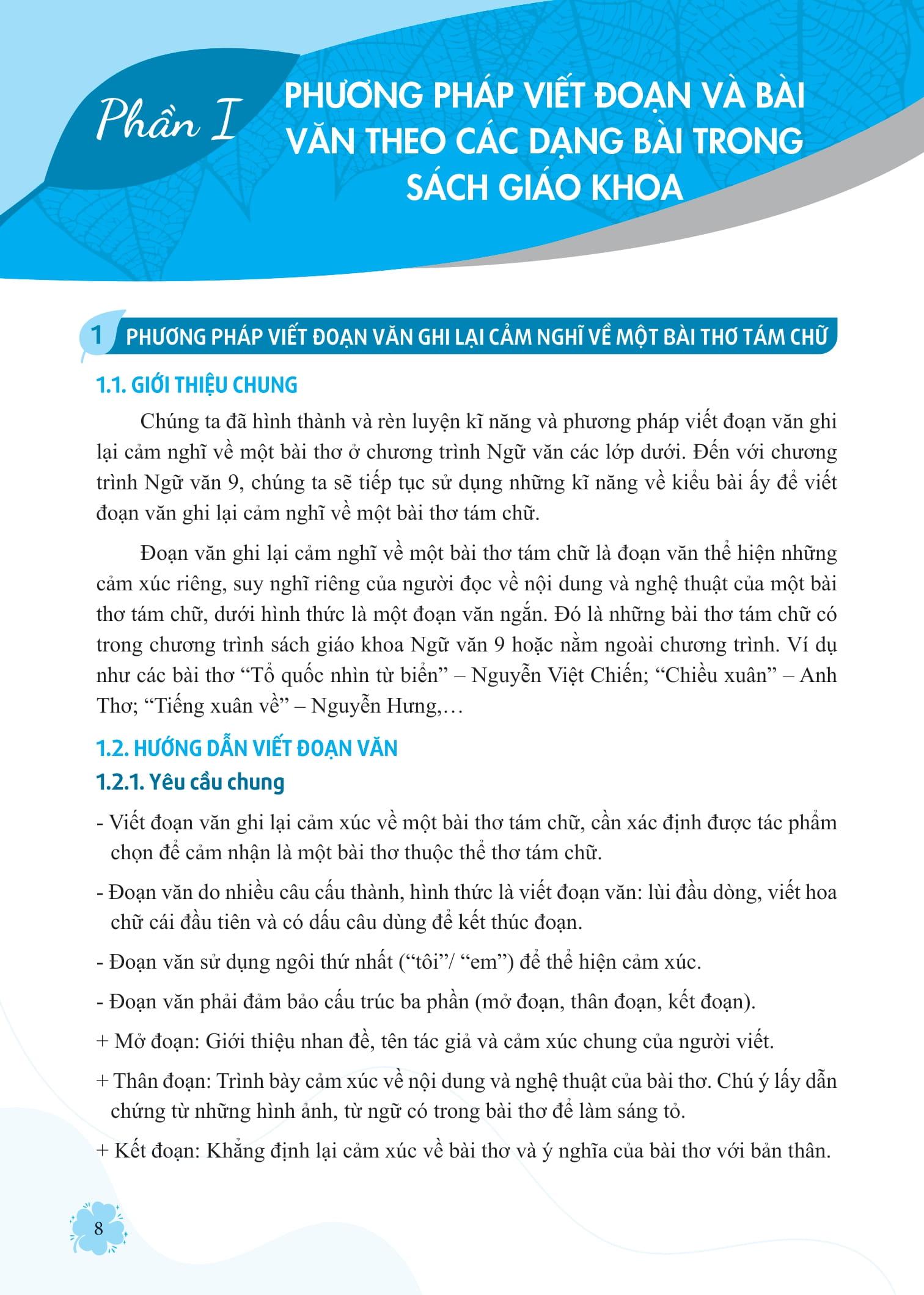 - Phương pháp viết đoạn và bài văn theo các dạng bài trong SGK: đưa ra những hướng dẫn tỉ mỉ, cụ thể cách viết đoạn văn ghi lại cảm xúc về một bài thơ 8 chữ và viết bài văn theo từng thể loại cụ thể (nghị luận xã hội, nghị luận văn học, thuyết minh, kịch).