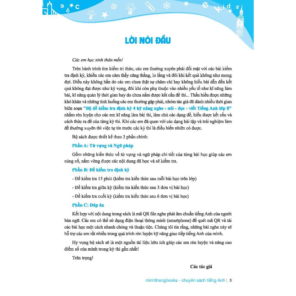 "Bộ đề kiểm tra định kỳ 4 kỹ năng nghe - nói - đọc - viết Tiếng Anh lớp 8" nhằm rèn luyện cho các em kĩ năng làm bài thi, làm chủ các dạng đề, hiểu được kết cấu và cách thức ra đề của từng kỳ thi. Khi các em đã quen với các dạng bài tập và trải nghiệm làm đề thường xuyên thì việc tự tin trước các kỳ thi là điều hiển nhiên có được.