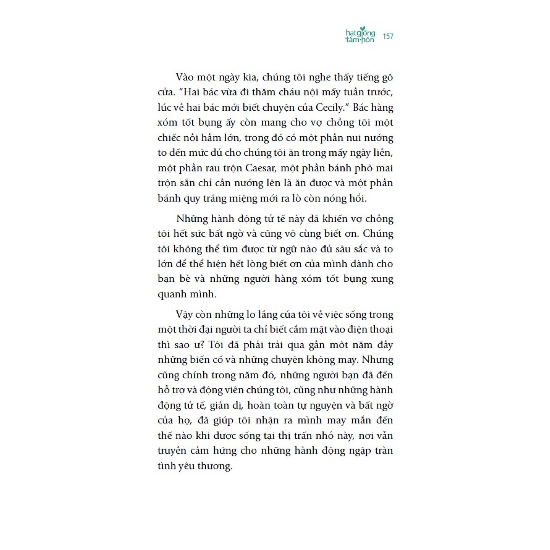- Suy nghĩ tử tế, thái độ tử tế, hành động tử tế để hạnh phúc trọn vẹn - Bạn có nghĩ một hành động nhỏ của mình có thể thay đổi cuộc đời của một người nào đó không, hoặc… ngược lại? Ở thời đại mà những tin tức xã hội tiêu cực tràn ngập mặt báo, các chủ đề về bạo lực, chiến tranh hay tiêu đề giật gân về đời sống riêng tư của người nổi tiếng lại là từ khóa được nhiều người tìm kiếm, thật khó để tin rằng thế giới này vẫn còn tồn tại tình yêu thương, sự tử tế hay những hành động giúp đỡ vô điều kiện giữa người với người. Dù vậy, tử tế vẫn là một trong những điều tốt đẹp nhất mà chúng ta có thể trao cho nhau. Sự tử tế không nhất thiết phải là những việc quá lớn lao, mà chúng có thể bắt nguồn từ những hạt mầm bé nhỏ được ta “gieo trồng” mỗi ngày. Đó có thể chỉ là những hành động đơn giản và ngẫu nhiên, nhưng theo thời gian, với “sự chăm bón” đúng cách, chúng có thể tạo nên những thay đổi lớn lao không chỉ cho mỗi cá nhân mà còn cho cộng đồng và thế giới. Đây cũng chính là thông điệp nhân văn mà quyển sách mang đến cho độc giả. Quyển sách gồm 27 câu chuyện đời thường đầy gần gũi và cảm động nói về lòng tốt và sự tử tế trong cuộc sống. Với văn phong giản dị nhưng không kém phần sâu sắc, khiến bạn cảm nhận được tình yêu thương vẫn luôn tồn tại dù cuộc đời này có khắc nghiệt đến đâu đi nữa. Và bạn sẽ nhận ra rằng khi bạn dịu dàng với thế giới này, bạn cũng sẽ nhận lại sự dịu dàng từ thế giới. Nối tiếp chủ đề ý nghĩa về sự tử tế của Bộ sách Hạt Giống Tâm Hồn, không mang đến những câu chuyện truyền cảm hứng về cuộc đời của một vĩ nhân hay một người nổi tiếng nào, mà quyển sách chứa đựng những câu chuyện bình dị mà ta dễ dàng bắt gặp trong cuộc sống hằng ngày. Đó có thể là câu chuyện của cậu bé Arthur cực kỳ thông minh nhưng mắc chứng tự kỷ sẵn sàng nhường đĩa bánh tiramisu yêu thích cho một người ăn xin bên đường. Hay câu chuyện về bác tài xế Mike tốt bụng cho hai cô sinh viên bị hỏng xe đi nhờ một đoạn đường giữa đêm bão tuyết, nhờ vậy mà vô tình cứu hai cô gái thoát khỏi vụ tai nạn kinh hoàng chỉ vài phút sau đó. Và còn nhiều câu chuyện nhân văn giàu ý nghĩa khác sẽ chạm đến trái tim bạn. Những cung bậc cảm xúc len lỏi trên từng trang sách sẽ giúp bạn nhận ra cuộc sống vốn muôn màu muôn vẻ. Mỗi người mà ta gặp trên đường đời này không ai là ngẫu nhiên và những hành động tử tế của bạn dành cho họ không điều gì là vô ích. Cũng trong quyển sách này, bạn sẽ bắt gặp được hình ảnh của chính mình, của những người xung quanh, hoặc đứng ở vị trí “người ngoài cuộc” để chiêm nghiệm, khám phá những điều thật sự ý nghĩa và tìm ra châm ngôn sống cho chính mình. Khép lại quyển sách , hy vọng bạn sẽ có thêm động lực để yêu thương bản thân và những người xung quanh bằng cách giúp đỡ mọi người, ngay cả khi đó là một hành động nhỏ. Hy vọng những hạt mầm tử tế từ những việc nhỏ này sẽ được gieo trong tâm hồn bạn, để từ đó được bạn vun trồng, tưới mát rồi có một ngày bạn sẽ nhận được quả ngọt mà hạt mầm nhỏ ấy mang lại. Về tác giả: là tác giả sách bán chạy, Tổng biên tập của bộ sách . Kể từ năm 20, bà đã xuất bản 190 tựa sách mới cho , hầu hết đều bán chạy tại Hoa Kỳ và Canada. được ghi nhận là người làm hồi sinh - thương hiệu nổi tiếng khắp thế giới, ra mắt lần đầu tiên vào năm 1993. Để làm được điều này, Amy đã tuyển chọn và biên soạn những câu chuyện có thật đầy cảm hứng - từ những con người bình thường có trải nghiệm phi thường. Qua đó, Amy giúp thương hiệu lâu đời “Chicken Soup for the Soul” luôn giữ được tính mới mẻ và phù hợp với độc giả ngày nay.