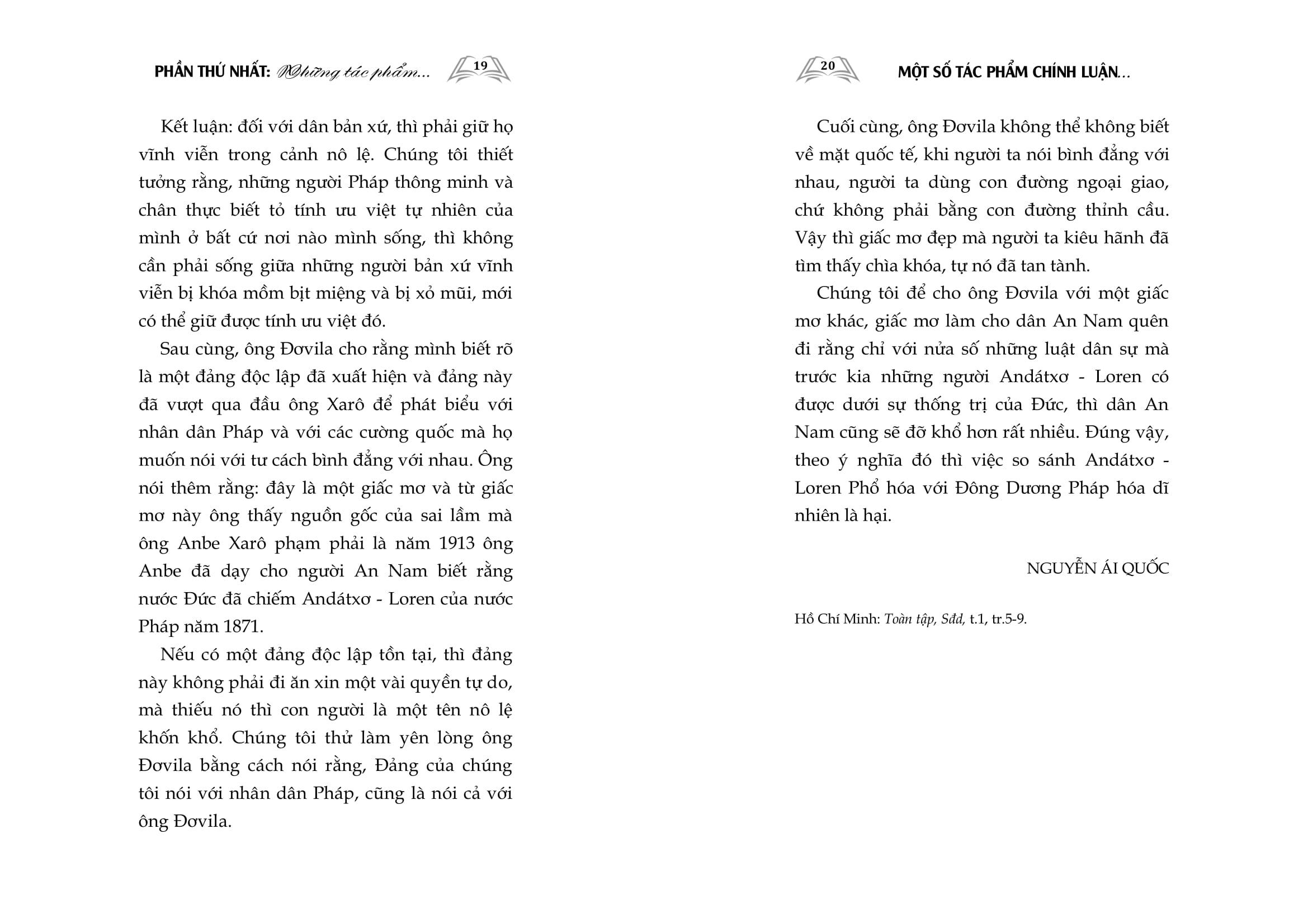 Cuốn sách là tập hợp một số tác phẩm chính luận trước 1969 của Chủ tịch Hồ Chí Minh, đặc biệt trong giai đoạn trước 1945. Đây là tư liệu then chốt để hiểu quá trình hình thành tư duy chính trị và chiến lược hành động của ông. Trong thời kỳ hoạt động tại Pháp, Anh, Liên Xô và Trung Quốc, Hồ Chí Minh đ.ã sử dụng chính luận như một công cụ để cất tiếng, xây dựng hình ảnh, tập hợp lực lượng trên các diễn ngôn quốc tế, với nội dung về chủ nghĩa đế quốc, quyền dân tộc và tình cảnh các nước thuộc địa. Những tác phẩm này thể hiện tư duy phân tích sắc sảo, hệ thống lập luận chặt chẽ, khả năng điều chỉnh giọng điệu và thông điệp tùy theo đối tượng tiếp nhận, và trên hết là nghệ thuật viết văn chính luận xuất sắc của Hồ Chí Minh.