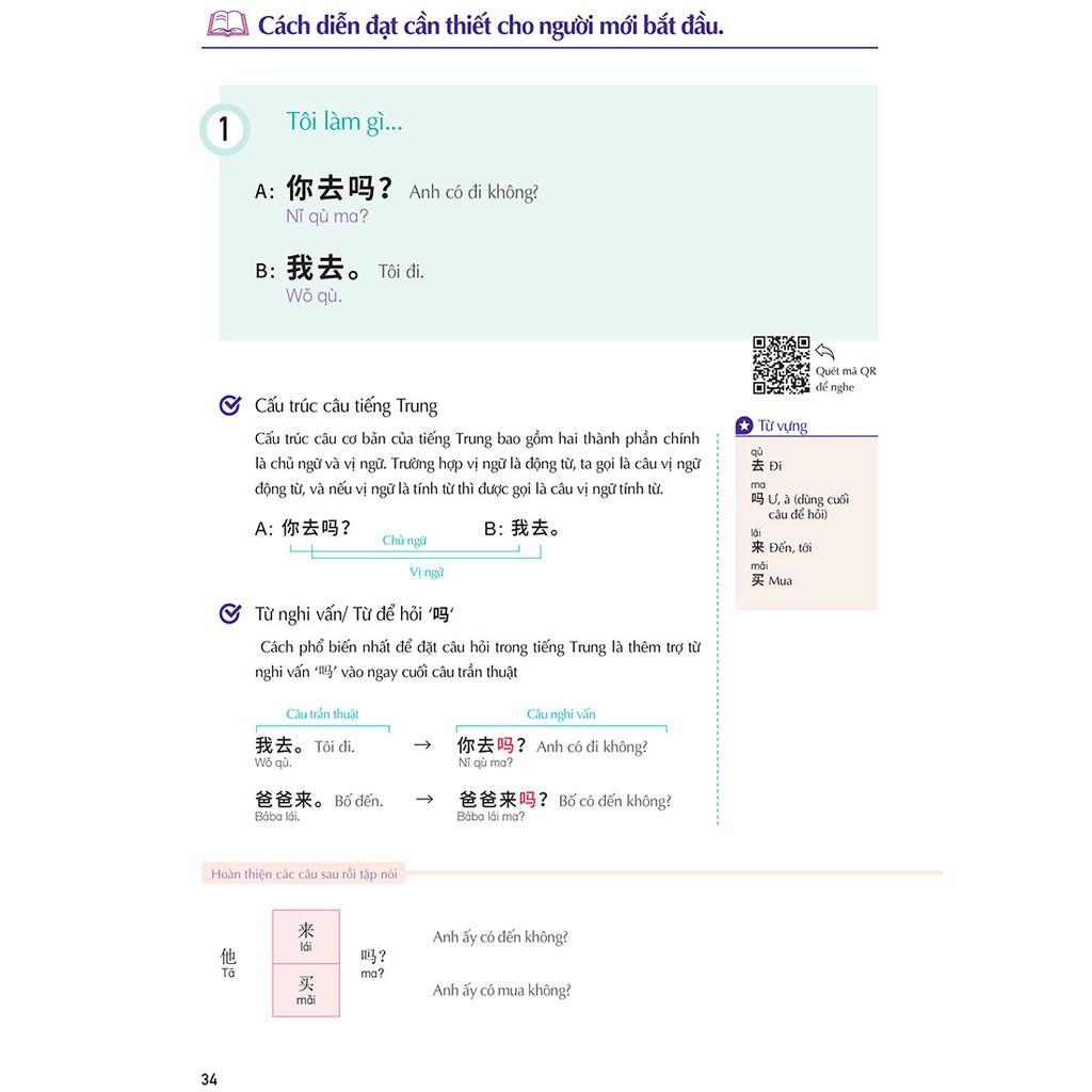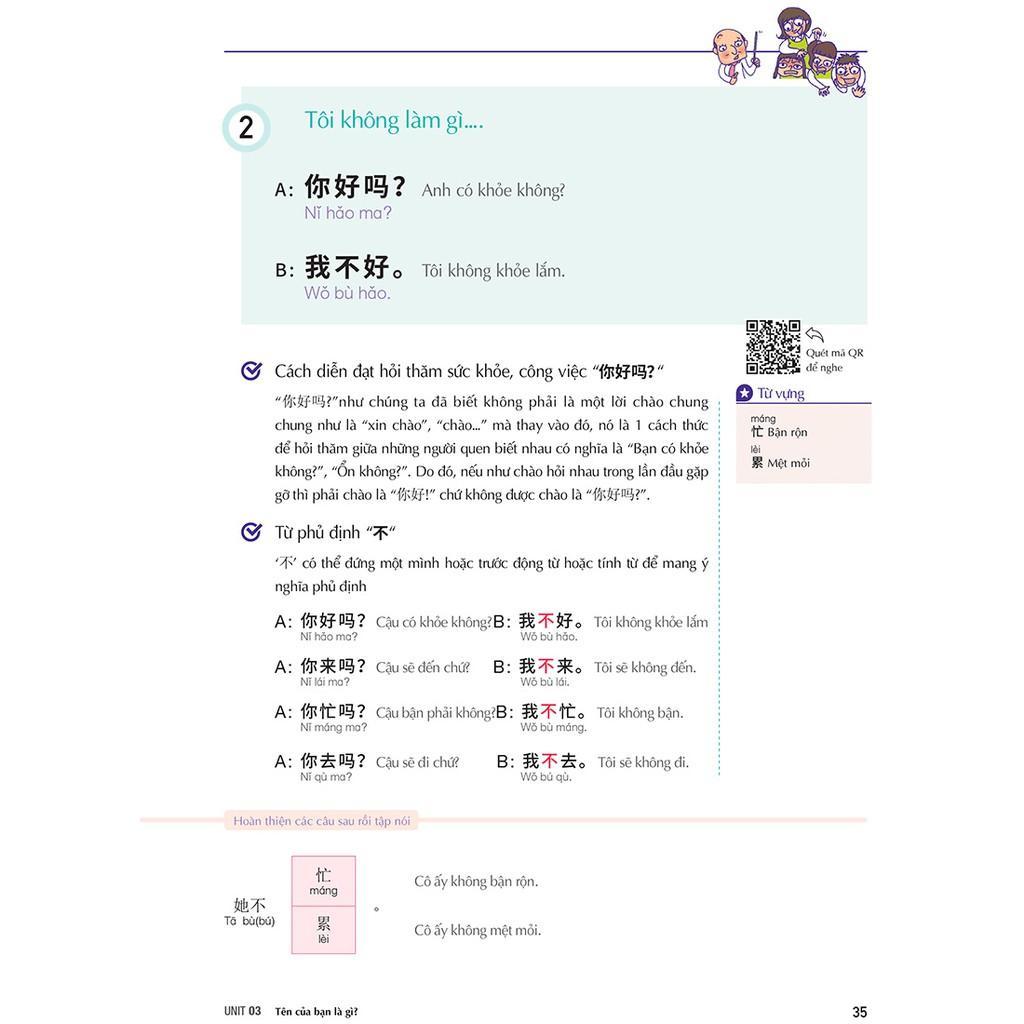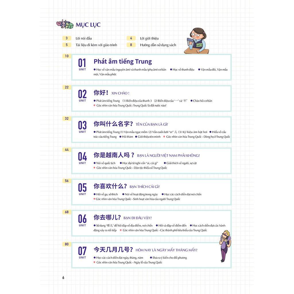 - Cấu trúc bài học chặt chẽ 15 bài học được hiệu đính tỉ mỉ, hoàn toàn khác biệt với những giáo trình tiếng Trung nặng nề khô khan khác. Mỗi bài học sẽ có cấu trúc như sau: Góc nhìn văn hóa Trung Quốc: Hình ảnh và mô tả ngắn gọn liên quan đến chủ đề bài học Cách diễn đạt cần thiết cho người mới bắt đầu Học từ vựng qua tranh Tự tin với hội thoại dài Mở rộng cách diễn đạt theo tranh và từ vựng Nâng cao năng lực bằng bài kiểm tra tổng kết
