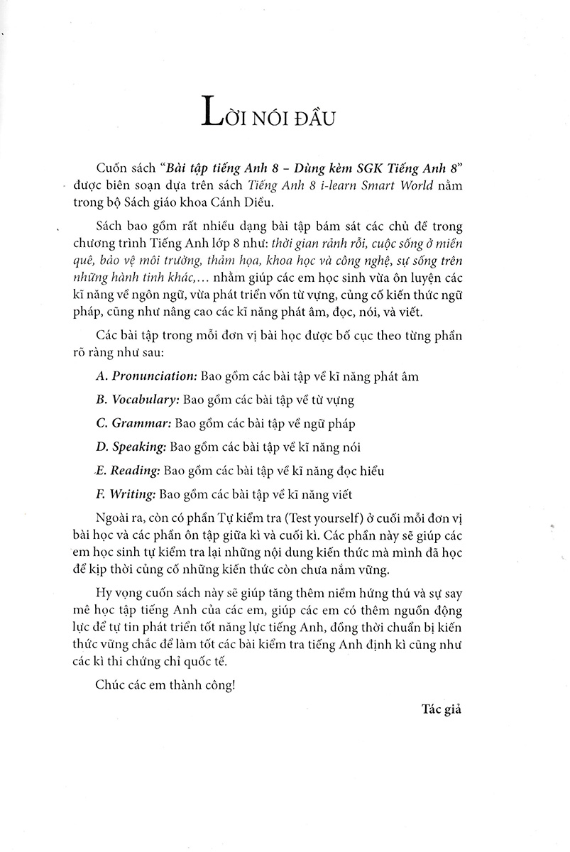 Bài Tập Tiếng Anh 8 (Không Đáp Án) Dùng Kèm SGK Tiếng Anh 8 (Bám Sát SGK Cánh Diều I-Learn Smart World) Cuốn sách “Bài tập tiếng Anh 8 – Dùng kèm SGK Tiếng Anh 8" được biên soạn dựa